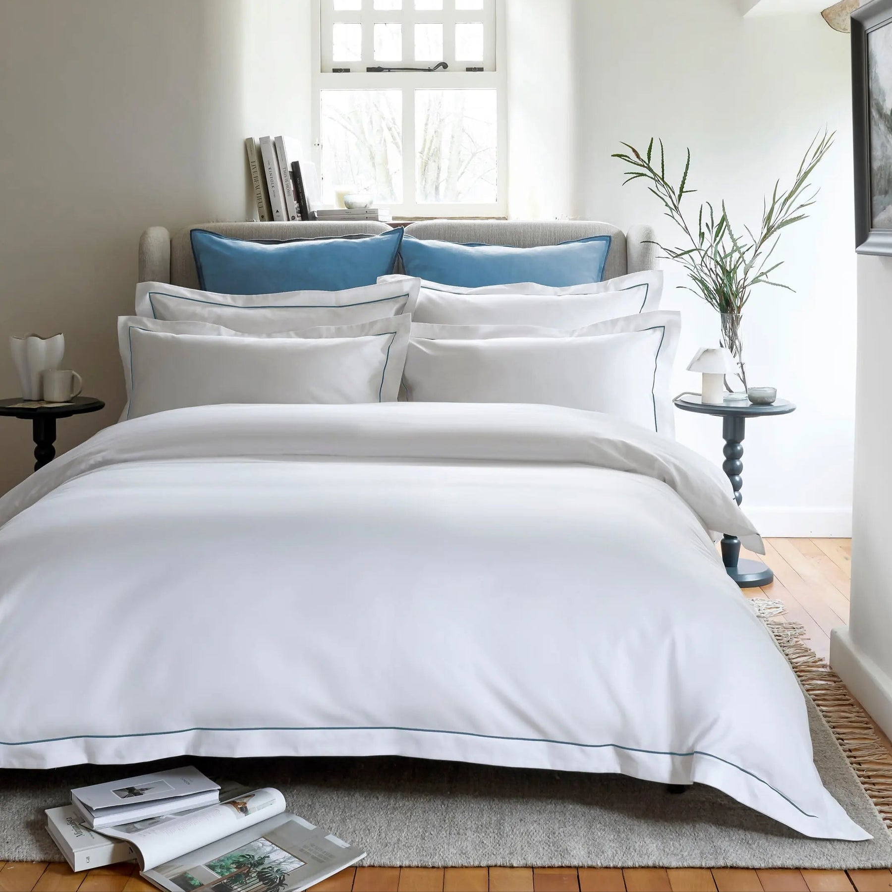 These coordinating Oxford pillowcases, finished with a blue trim and are expertly made from premium sateen fabric. The 100% cotton uses innovative Hygro® technology, each fibre is spun to create a hollow core that traps air, offering natural insulation to keep you warm on colder nights. In warmer temperatures, its breathable construction helps wick away moisture, ensuring you stay cool and comfortable.
