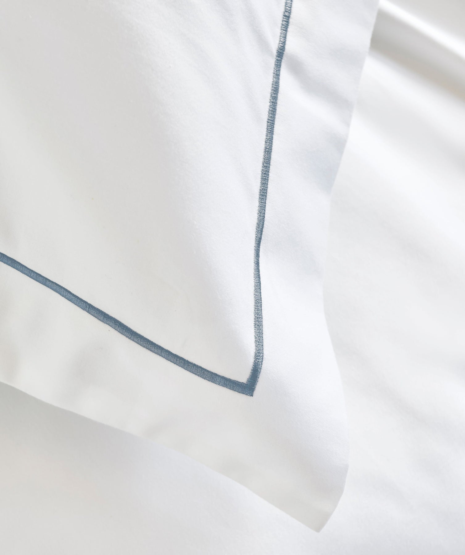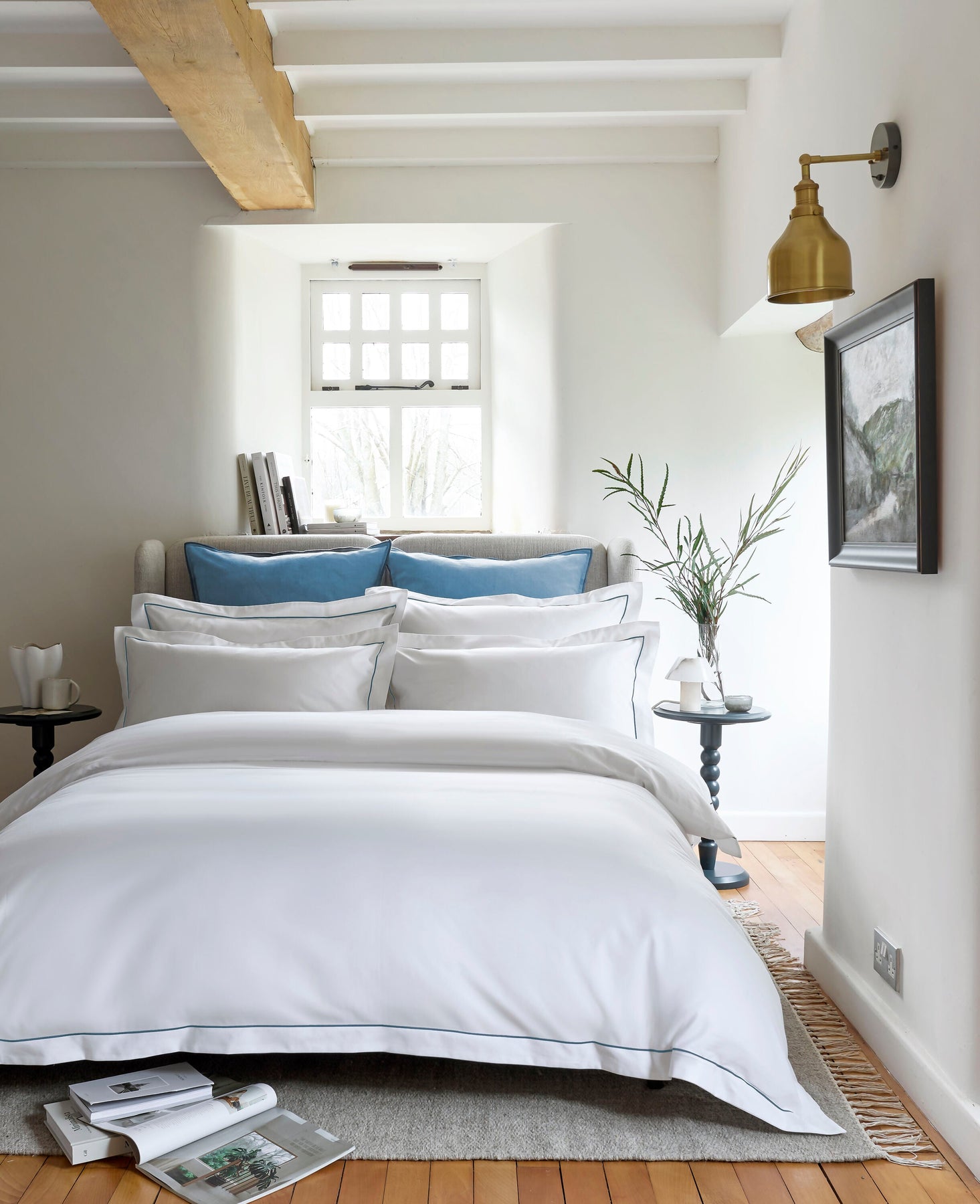 Optimise your sleep quality with this Christy Premium Sateen Double Duvet Set with blue trim. Thanks to a sumptuously soft sateen finish, premium 500 thread count and moisture-wicking properties, you are enveloped in a cocoon of comfort.