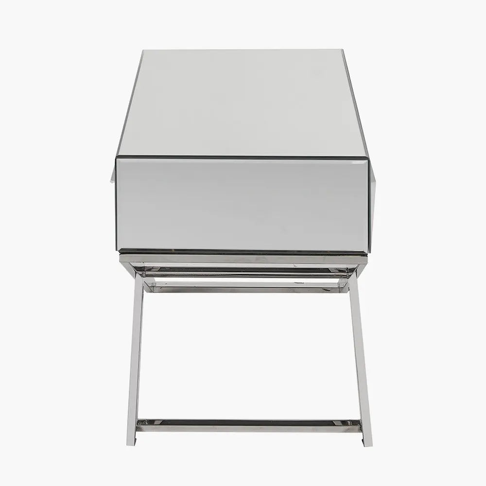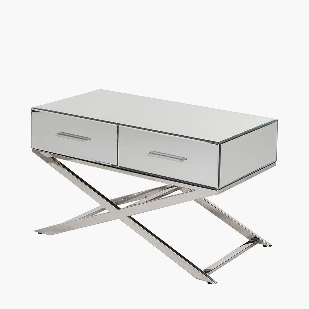 The Rocco Mirrored Glass and Silver Metal Coffee Table exudes sophistication and elegance, making it a striking centrepiece for any living room. Featuring a chic cross-leg design in silver metal and a bevel-edged mirrored glass top, this coffee table blends contemporary glamour with practical functionality.
