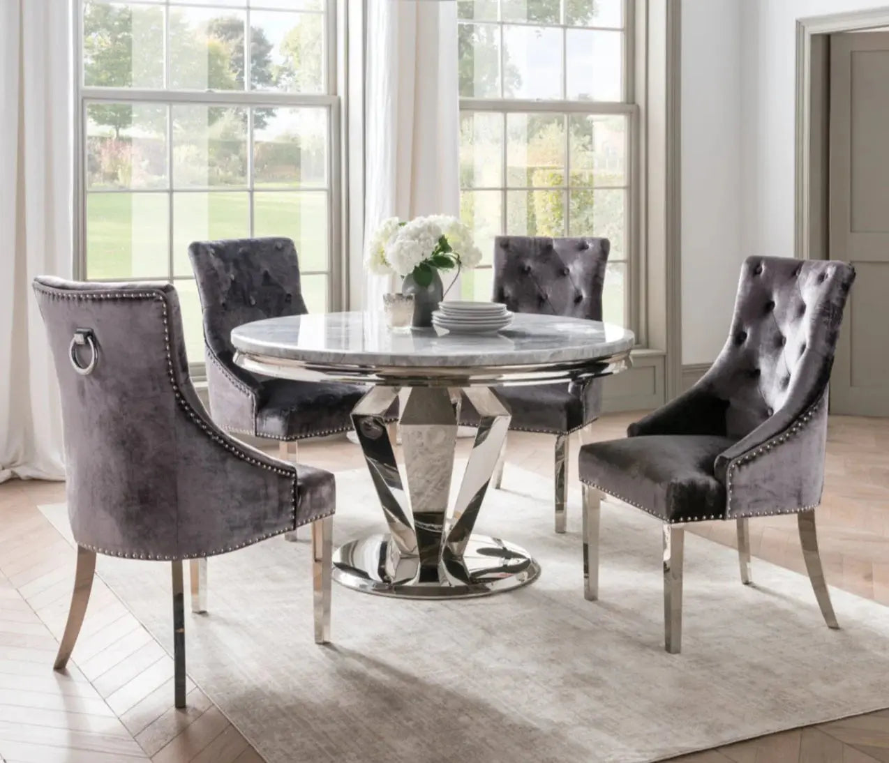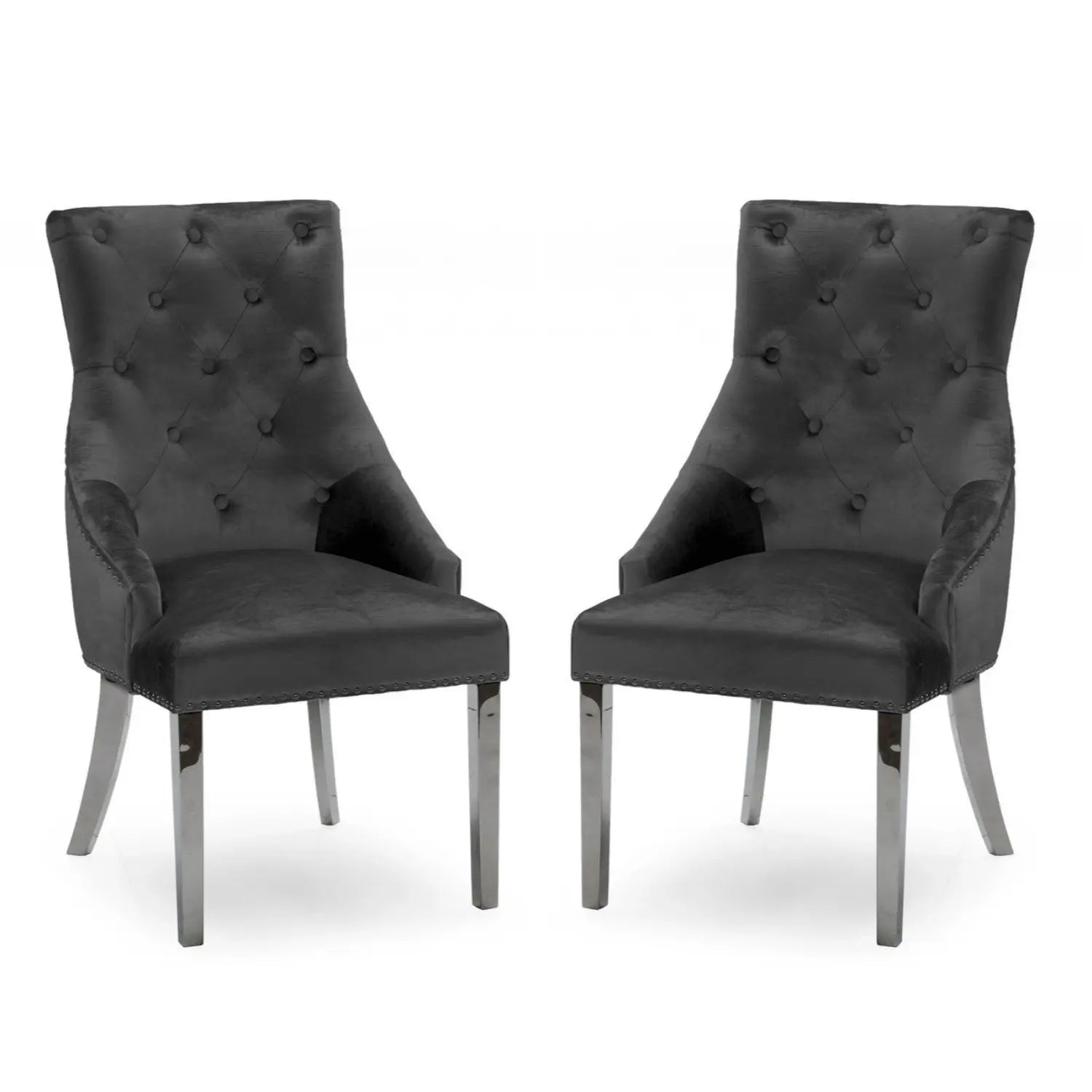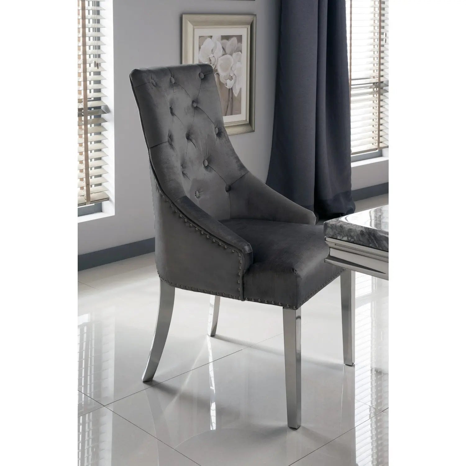 Elevate your dining space with the Belvedere Charcoal Knockerback Dining Chair—a charcoal velvet dining chair that perfectly fuses classic design and modern luxury. Upholstered in richly textured charcoal velvet, this piece adds dramatic depth and timeless elegance to any interior.