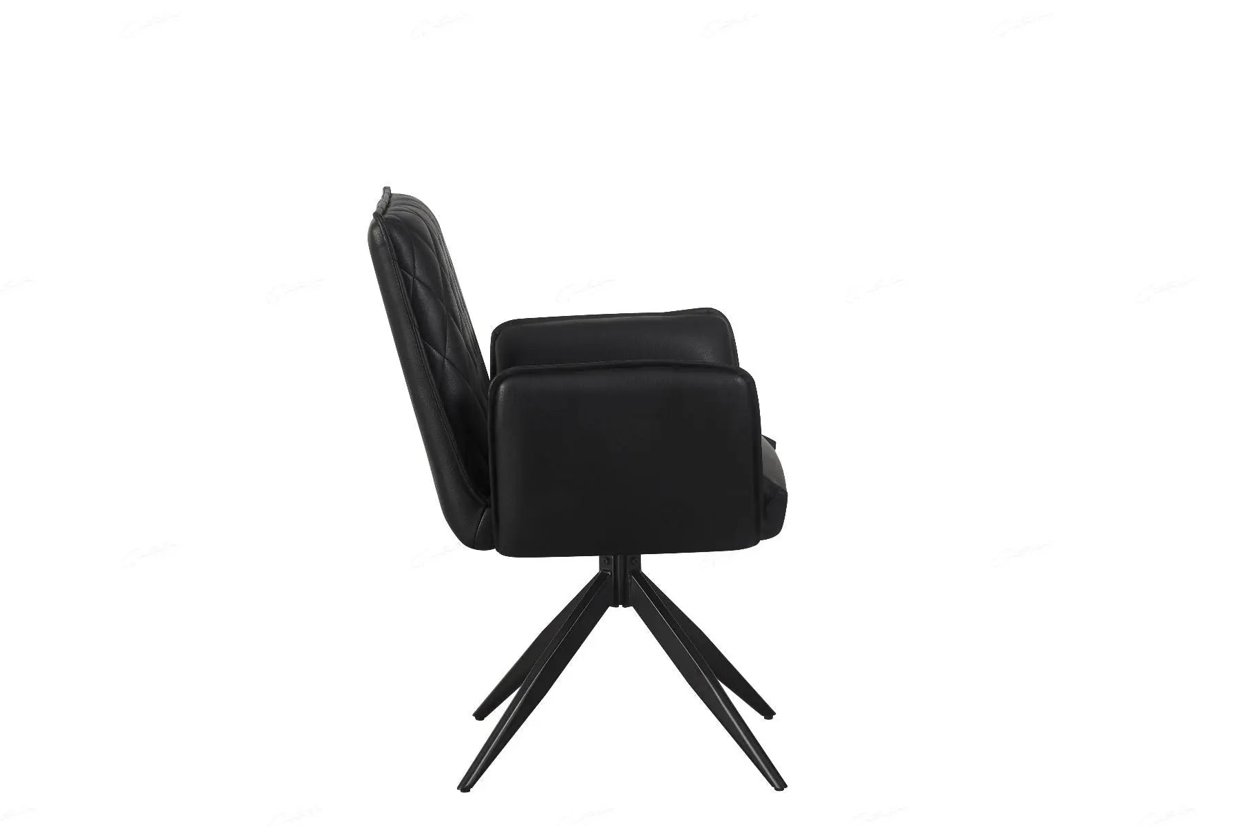 Designed for versatility, the chair features a 360-degree swivel base with sturdy black metal legs, allowing effortless rotation and easy movement for conversations and gatherings. Its blend of comfort, style, and adaptability makes it a standout piece for contemporary interiors.