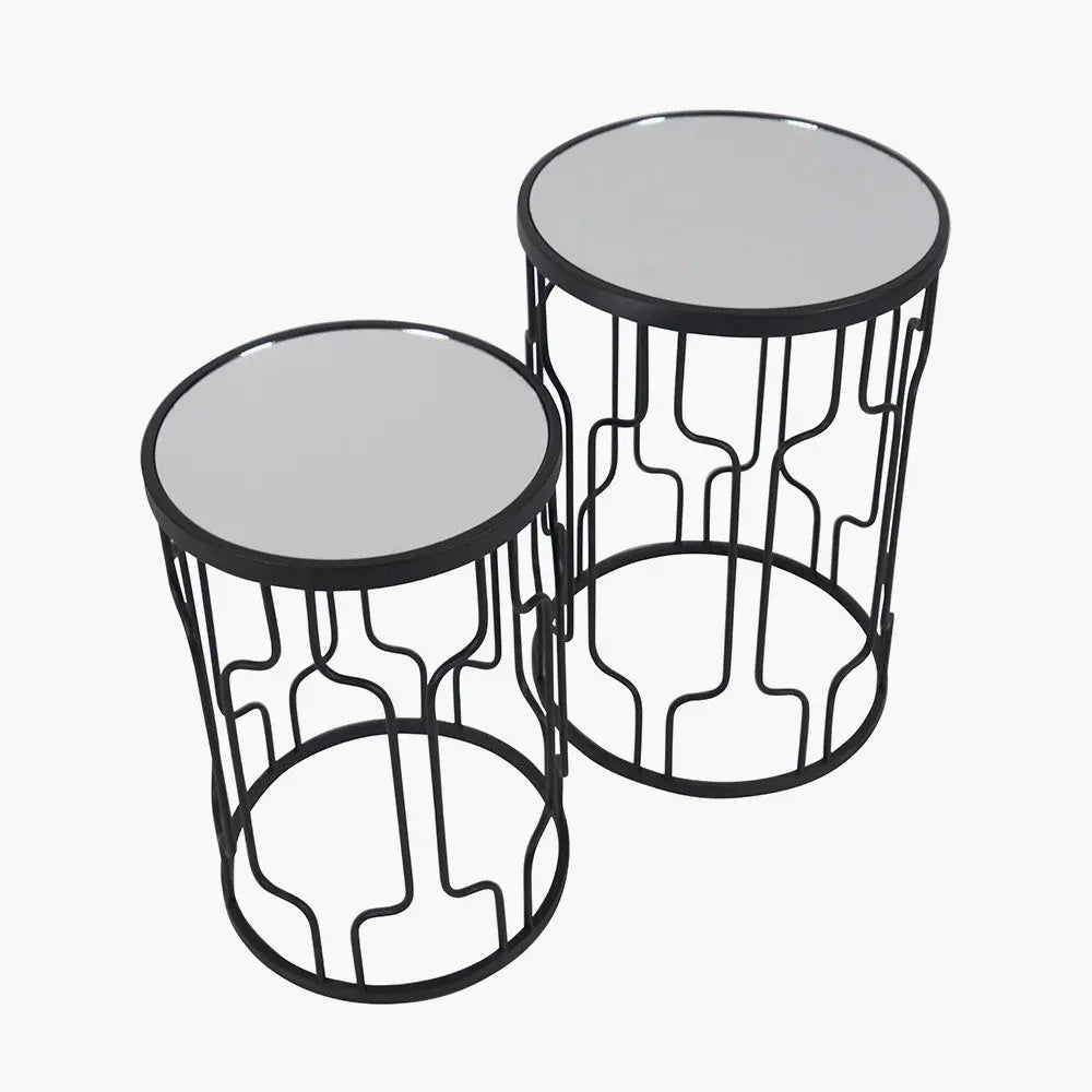 The Caprisse Set of 2 Mirrored Glass and Graphite Metal Side Tables combines Art Deco-inspired elegance with modern functionality. Featuring sleek black metal frames and reflective mirrored glass surfaces, these circular side tables make a striking addition to any living room, bedroom, or lounge area.