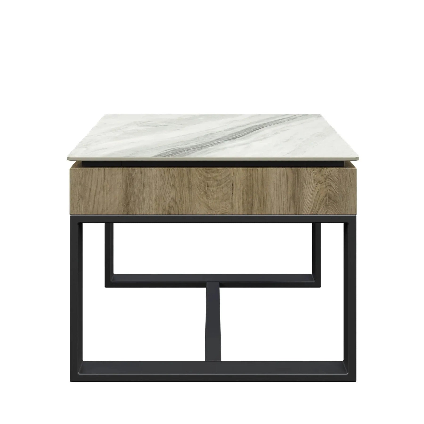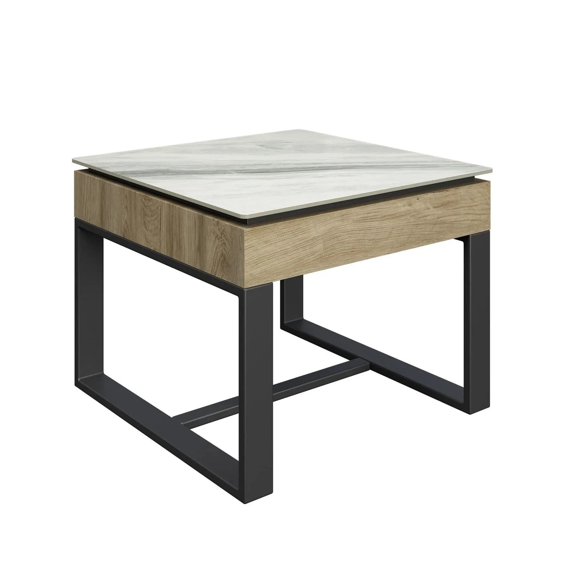 The side table showcases a White Shell sintered stone ceramic top, paired with an 8cm thick MDF structure and a wooden veneer frame, all supported by gunmetal grey powder-coated metal legs. This combination ensures not only luxurious aesthetics but also exceptional sturdiness and durability for long-lasting use.