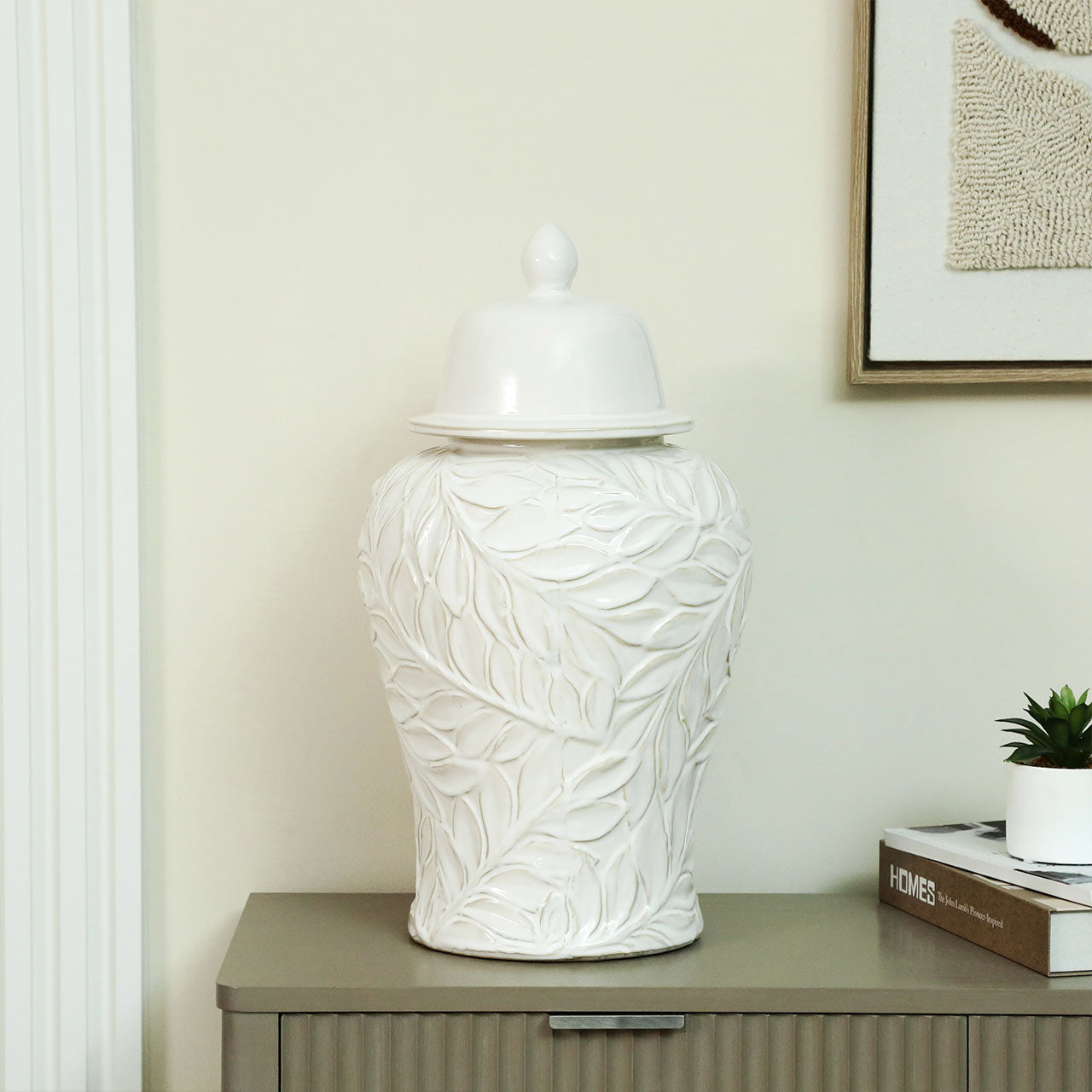 With its clean white tone and delicate carvings, this ceramic ginger jar complements both modern minimalist and traditional interiors, making it a lasting addition to your home décor.