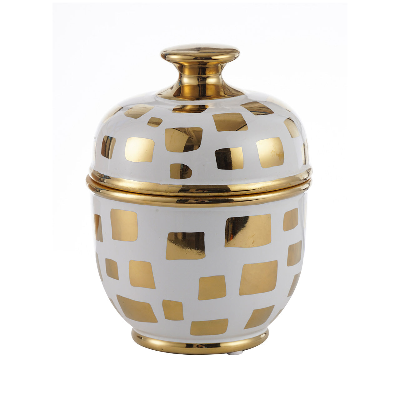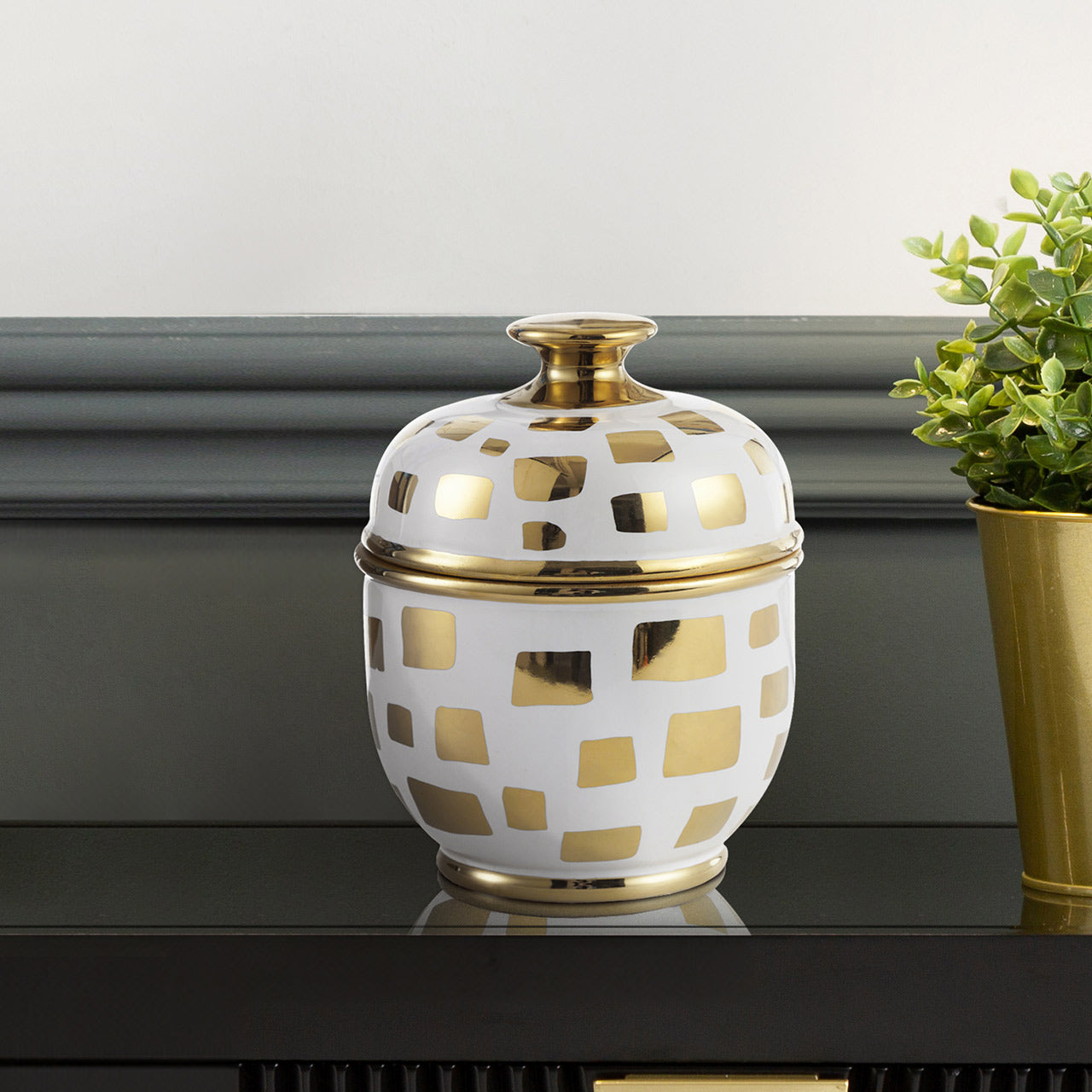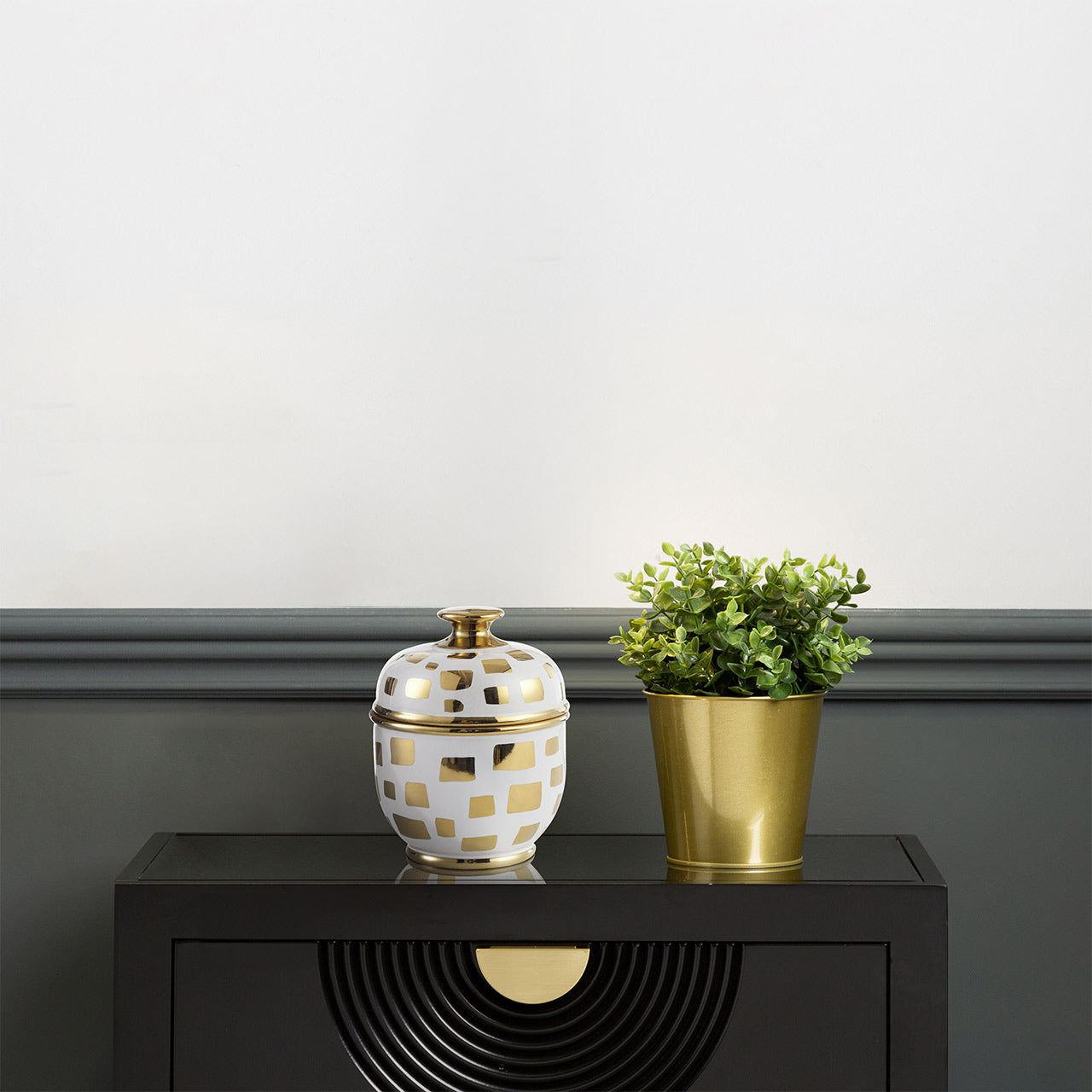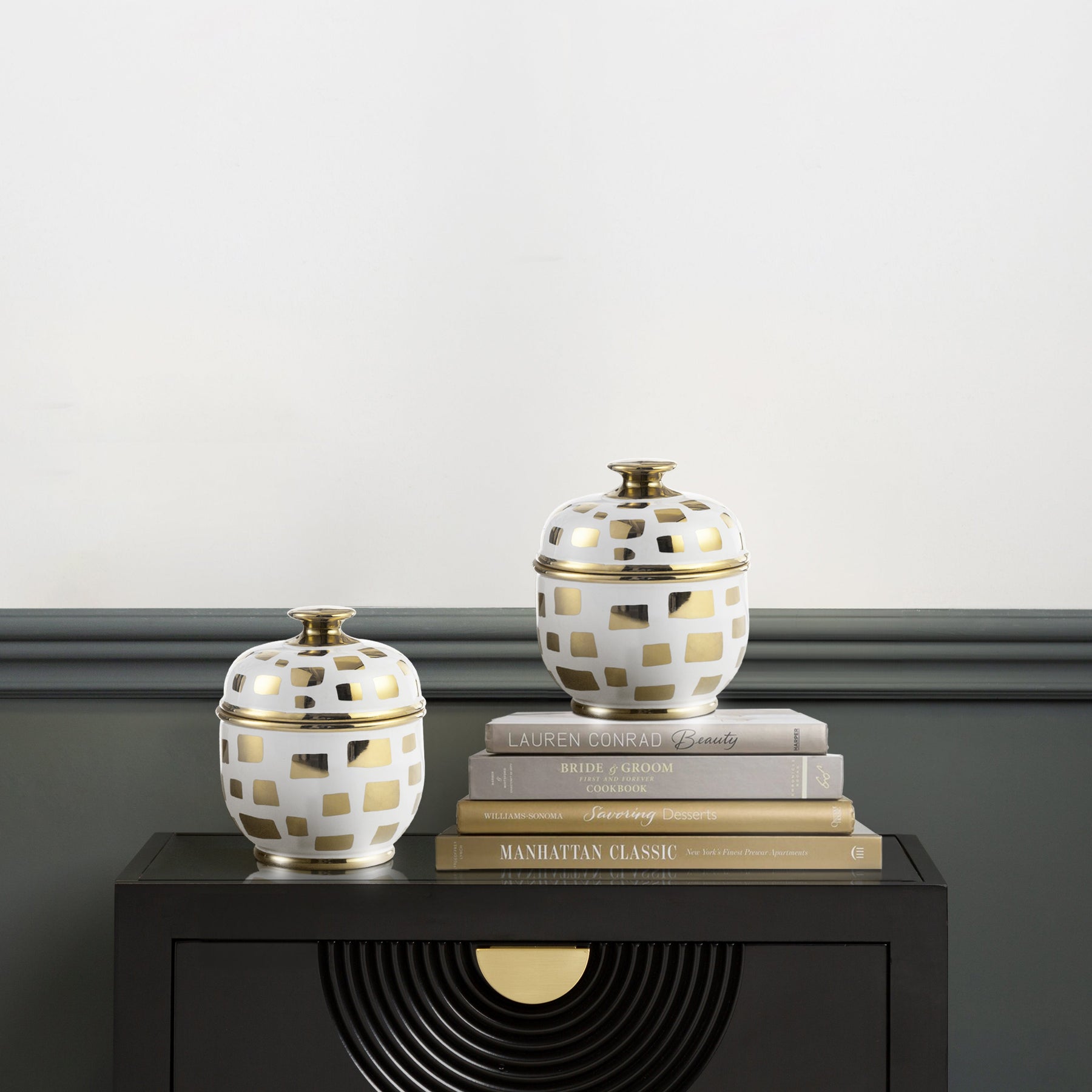 Perfect for styling on shelves, coffee tables, sideboards, or mantels, its smaller size makes it a versatile accent that works well as a standalone statement or within a curated decorative arrangement. The classic ginger jar silhouette combined with its chic white-and-gold design ensures it complements both modern and traditional décor styles.