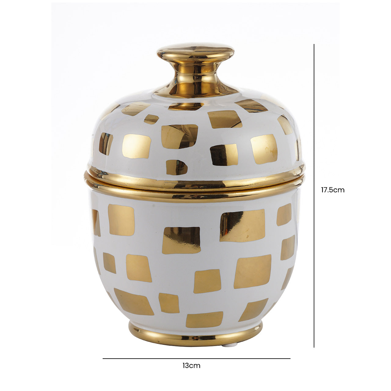 Bring refined elegance to your interiors with our White & Gold Decorative Ceramic Ginger Jar, a sophisticated piece that adds timeless charm to any space. Crafted from high-quality ceramic, this compact jar showcases a pristine white finish beautifully enhanced with luxurious gold detailing for a touch of glamour.