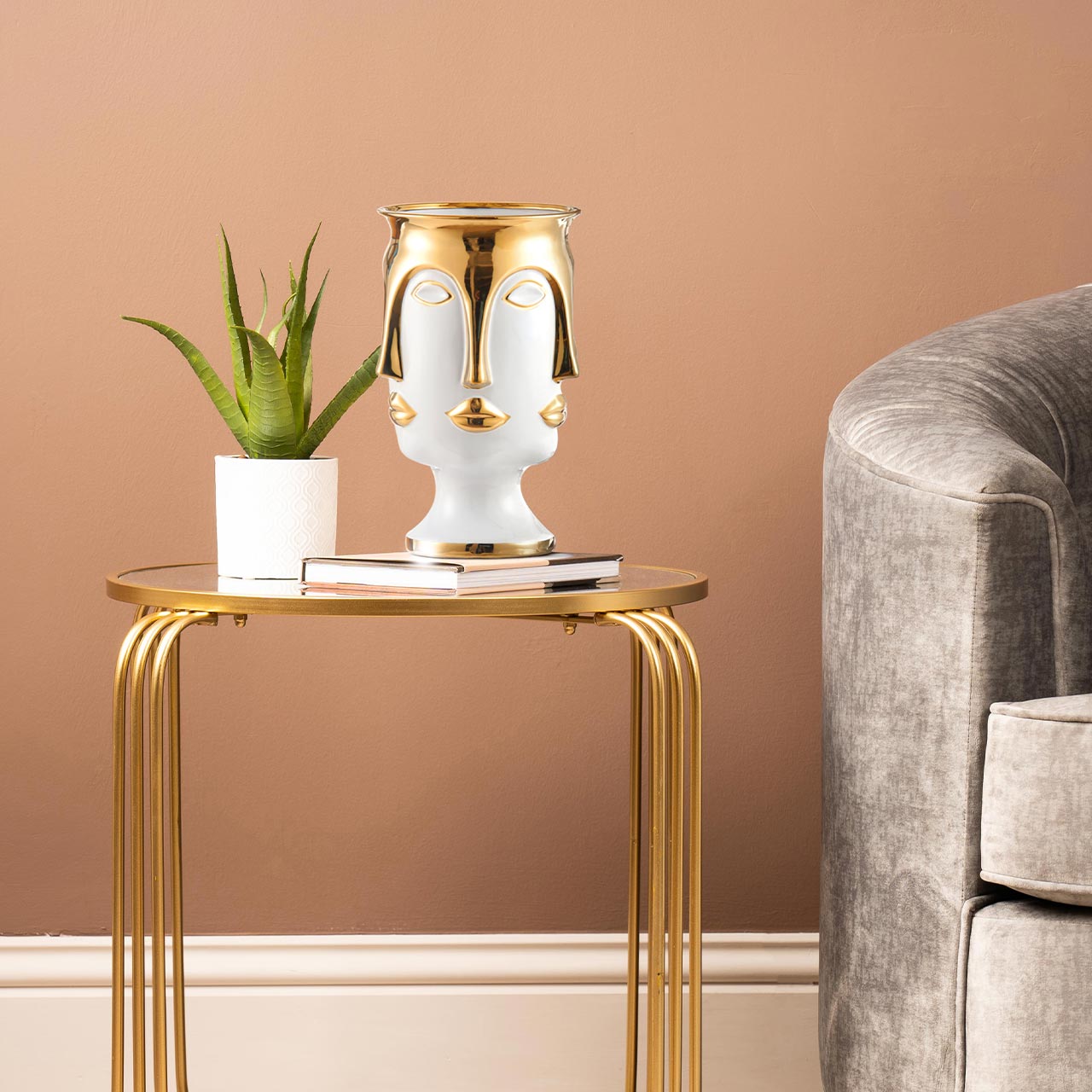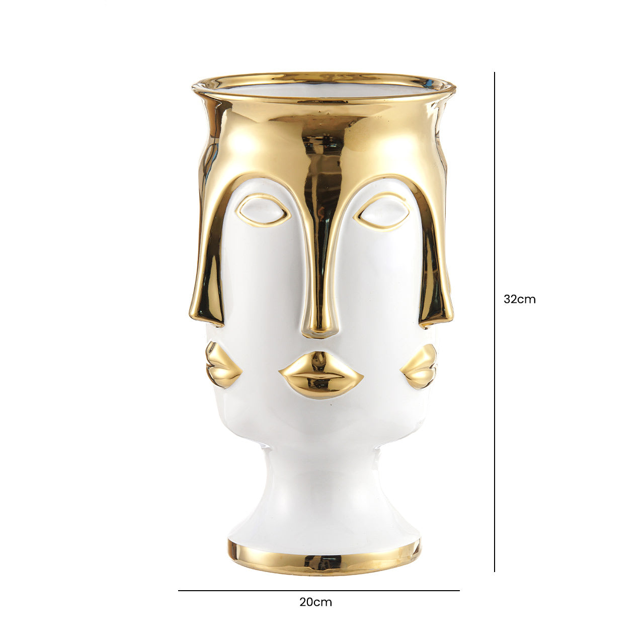 Transform your space with this eye-catching White and Gold Face Ceramic Vase. Standing at 32 cm, this sculptural piece combines contemporary artistry with luxurious design. Crafted from premium ceramic, it features a glossy white finish adorned with abstract gold facial detailing that adds both character and elegance to any interior.