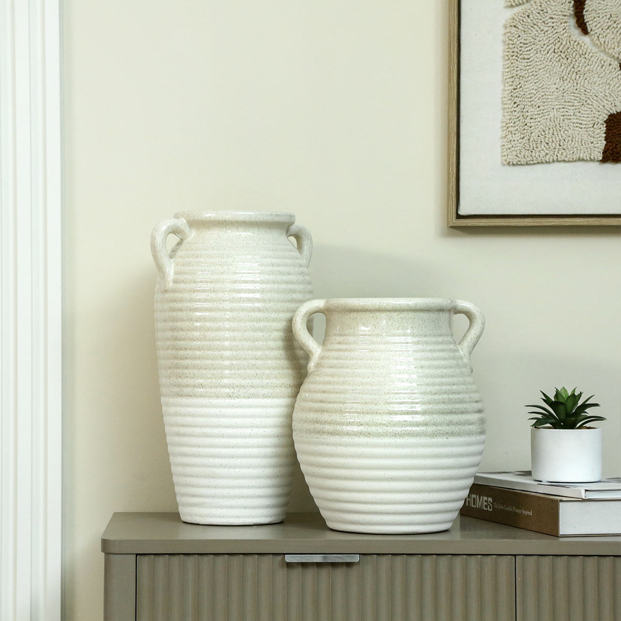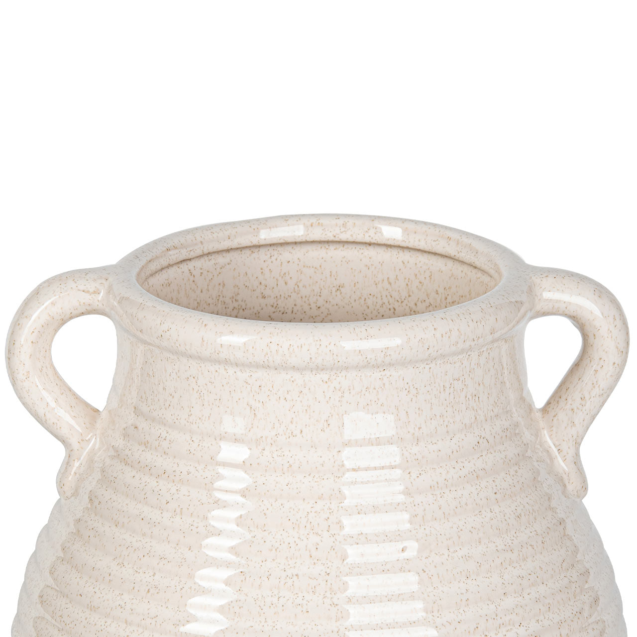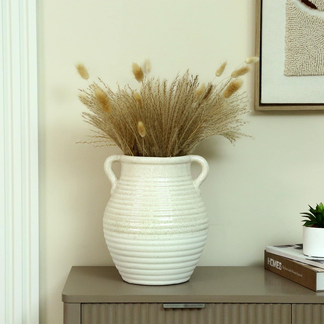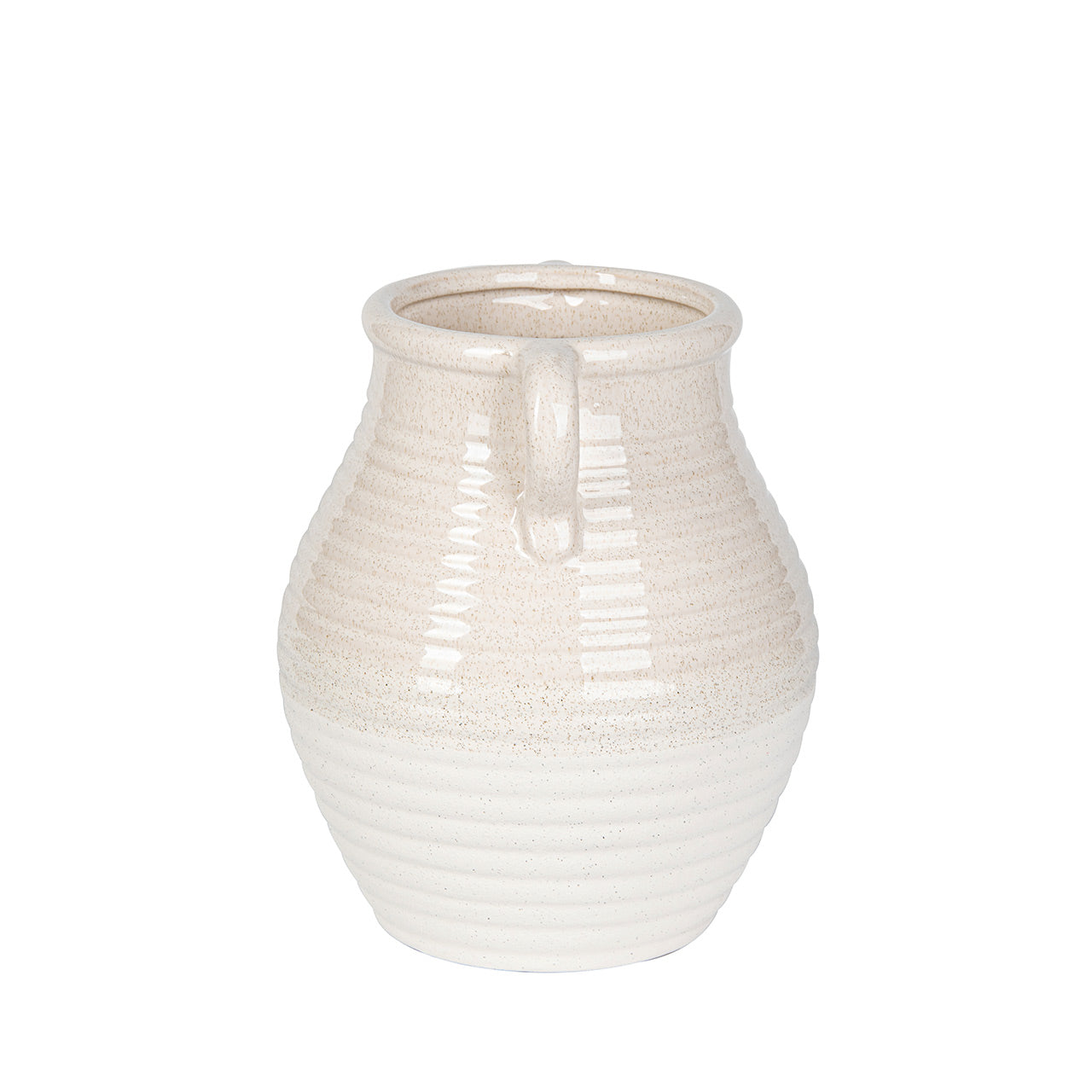 Bring artisanal charm and natural elegance to your space with this Beige and White Ribbed Ceramic Vase. Handcrafted and hand-painted, it showcases a calming beige and white finish with a gently ribbed texture, offering both visual depth and a tactile feel. Its classic rounded silhouette with twin handles adds a touch of rustic refinement to any room.