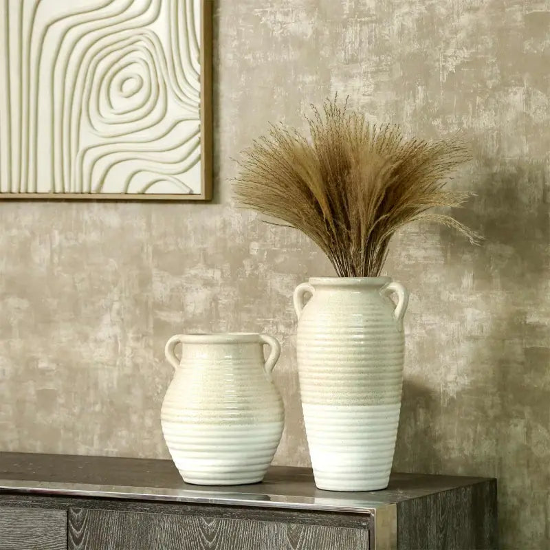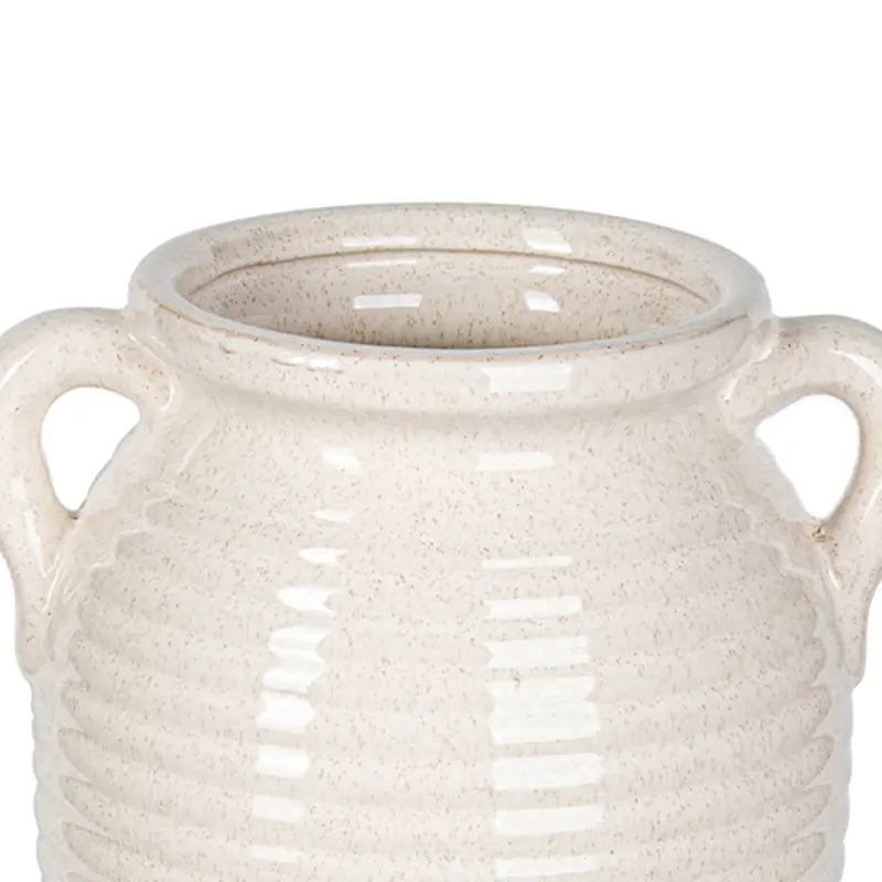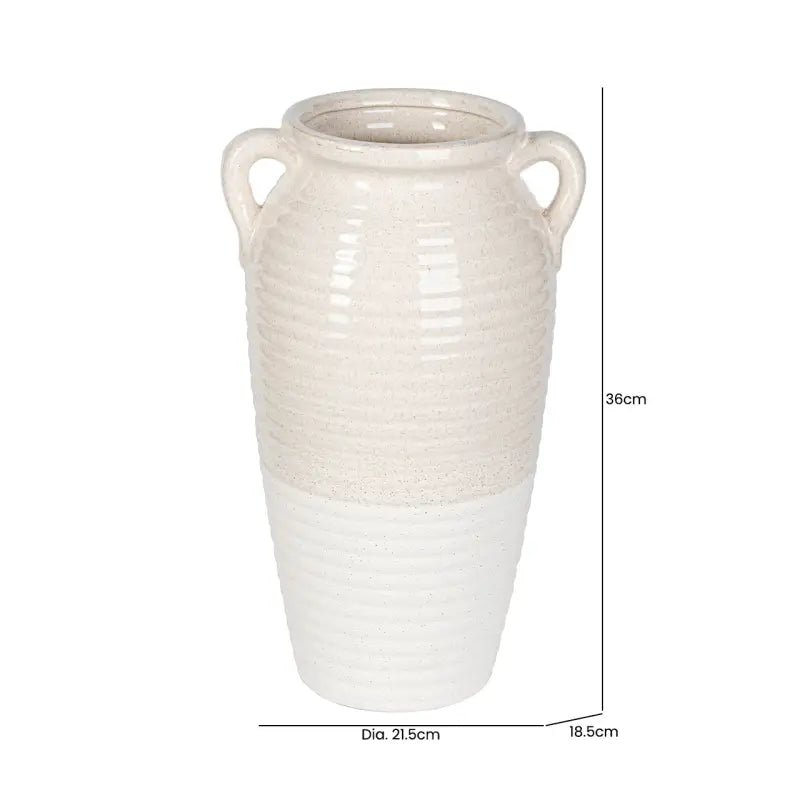 Introduce artisanal charm and understated elegance to your home with this Beige and White Ribbed Ceramic Vase. Expertly handcrafted and hand-painted, it features a calming blend of beige and white tones complemented by a ribbed texture that adds depth and warmth. The subtle finish and classic silhouette make it a versatile decorative piece for any room.