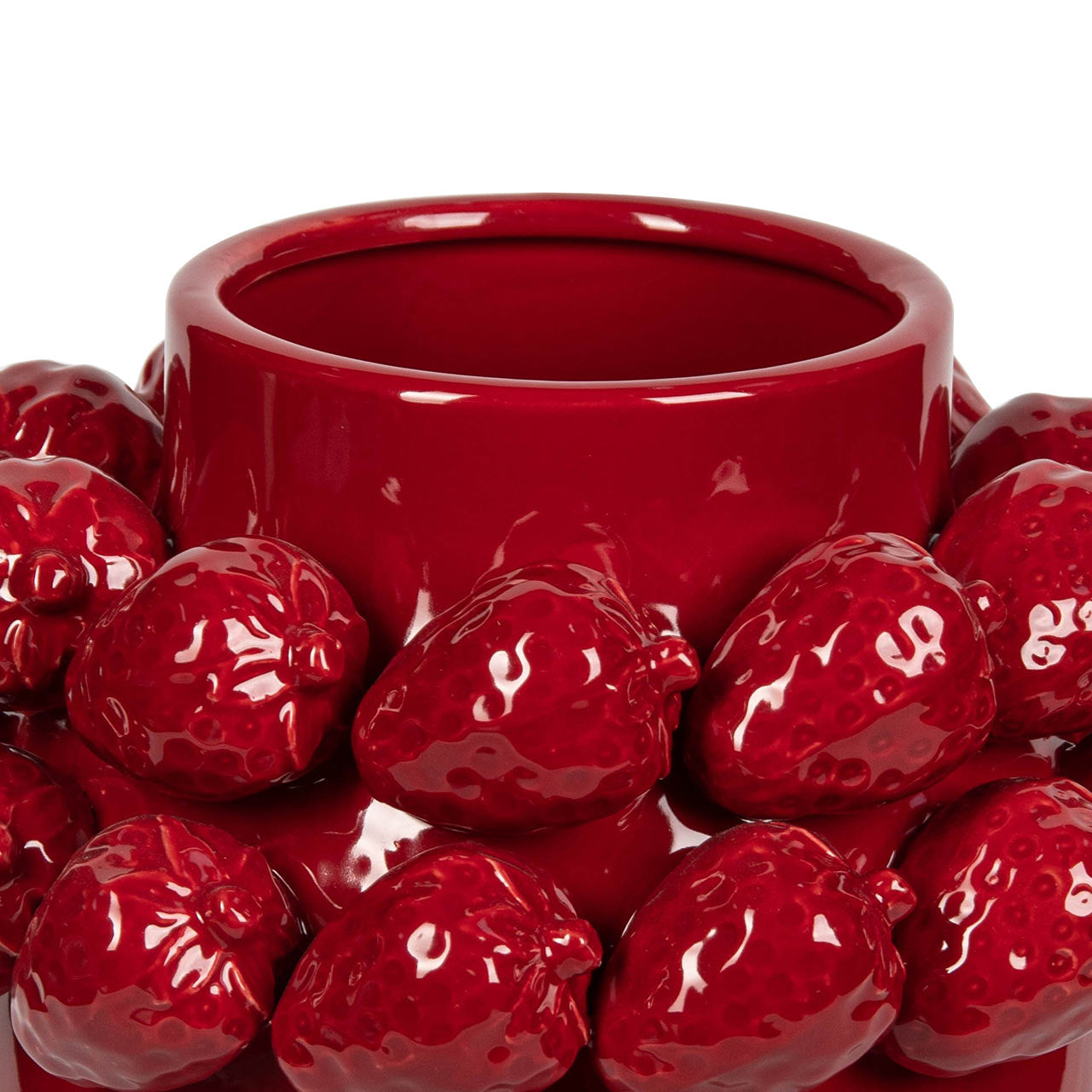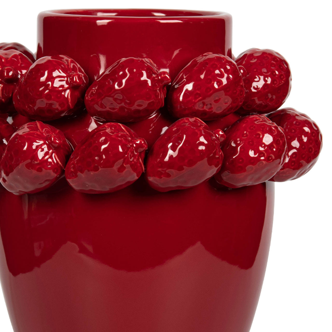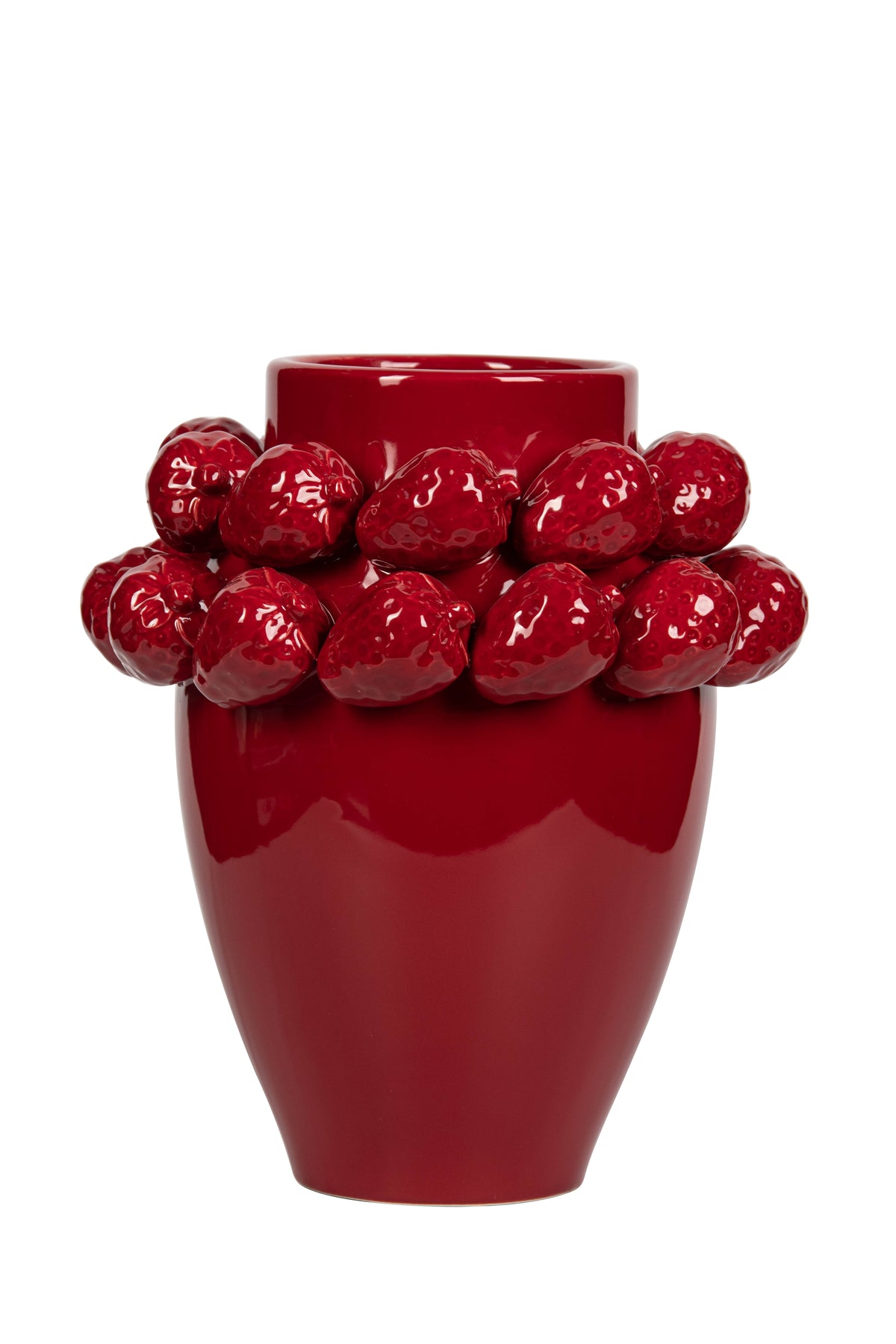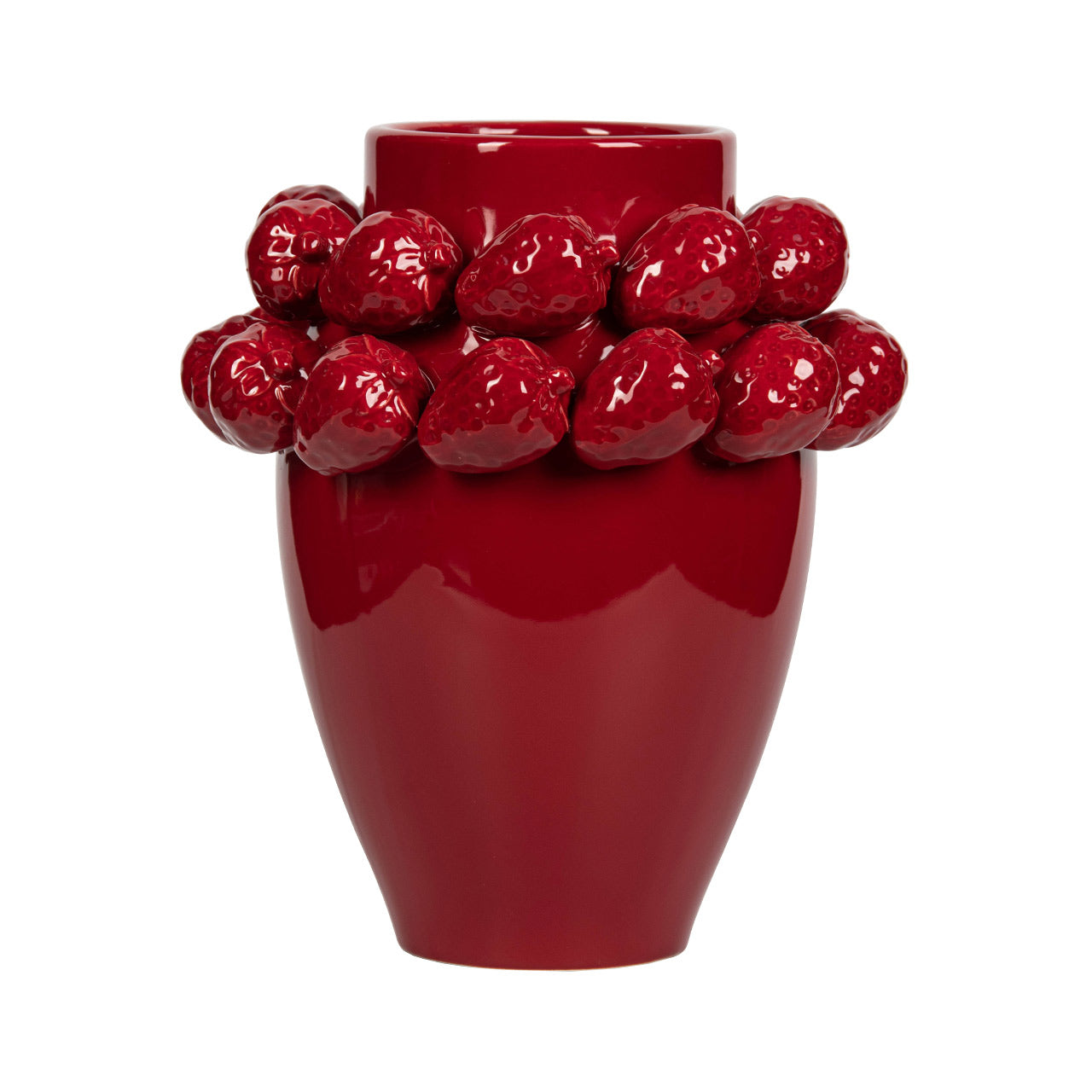 Bring charm and sophistication to your décor with this Red Strawberry Ceramic Vase. Crafted from smooth ceramic with a rich, glossy red glaze, it features an intricate ring of sculpted strawberries around the rim—adding playful texture and a touch of artistry. Its sleek silhouette ensures it blends seamlessly with both modern and classic interiors.