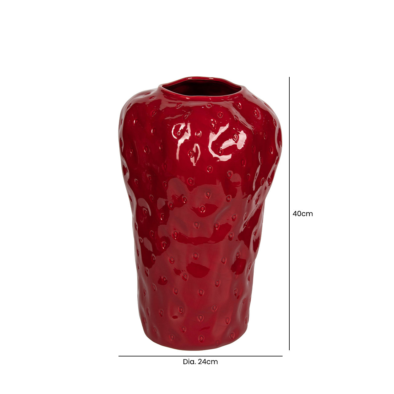 Make a bold statement with this striking Red Strawberry Ceramic Vase. Standing at 40 cm tall, it showcases a sculpted strawberry-inspired texture finished in a glossy red glaze, adding instant vibrancy and charm to your home. The smooth curves and playful surface detail create a contemporary art-like feel that effortlessly draws the eye.
