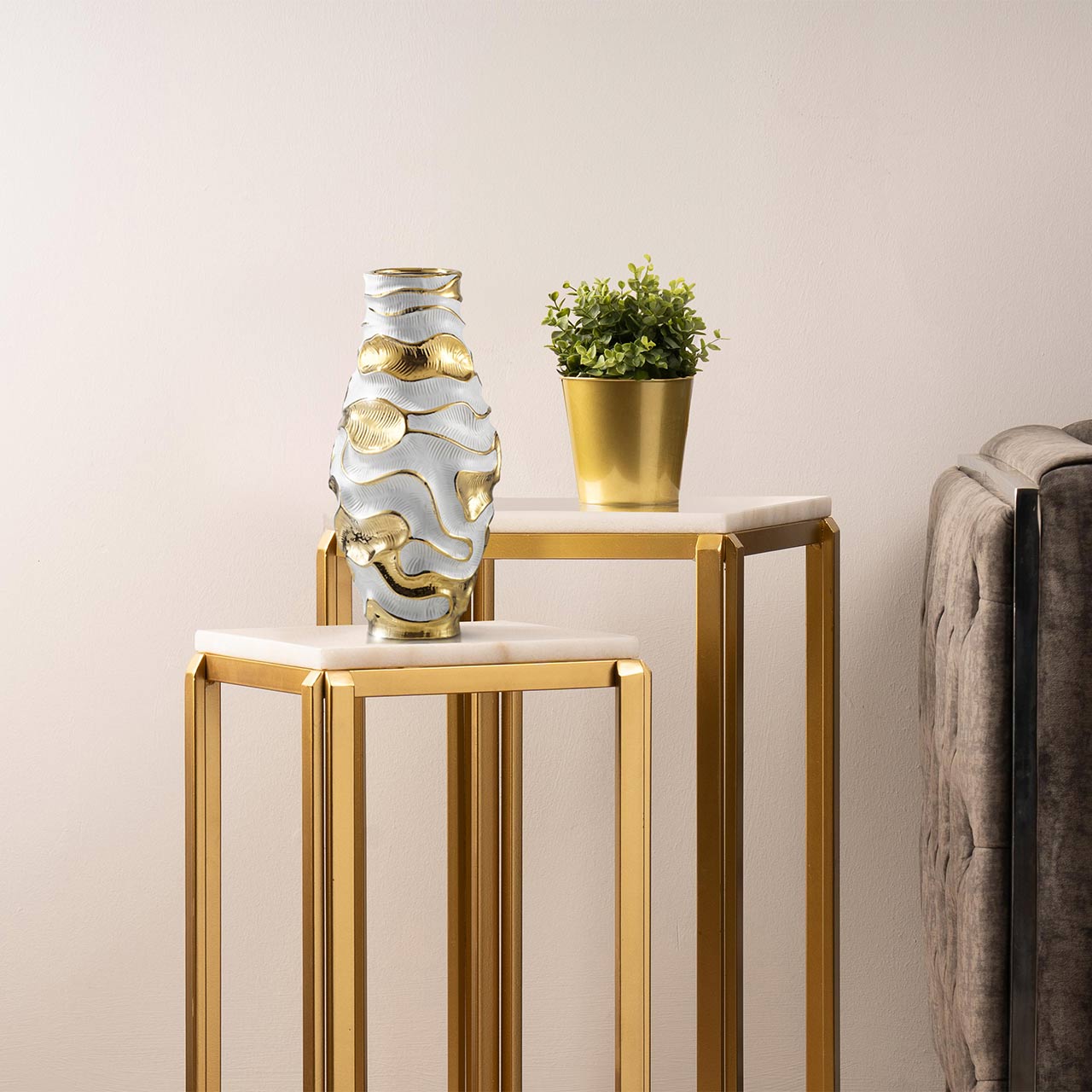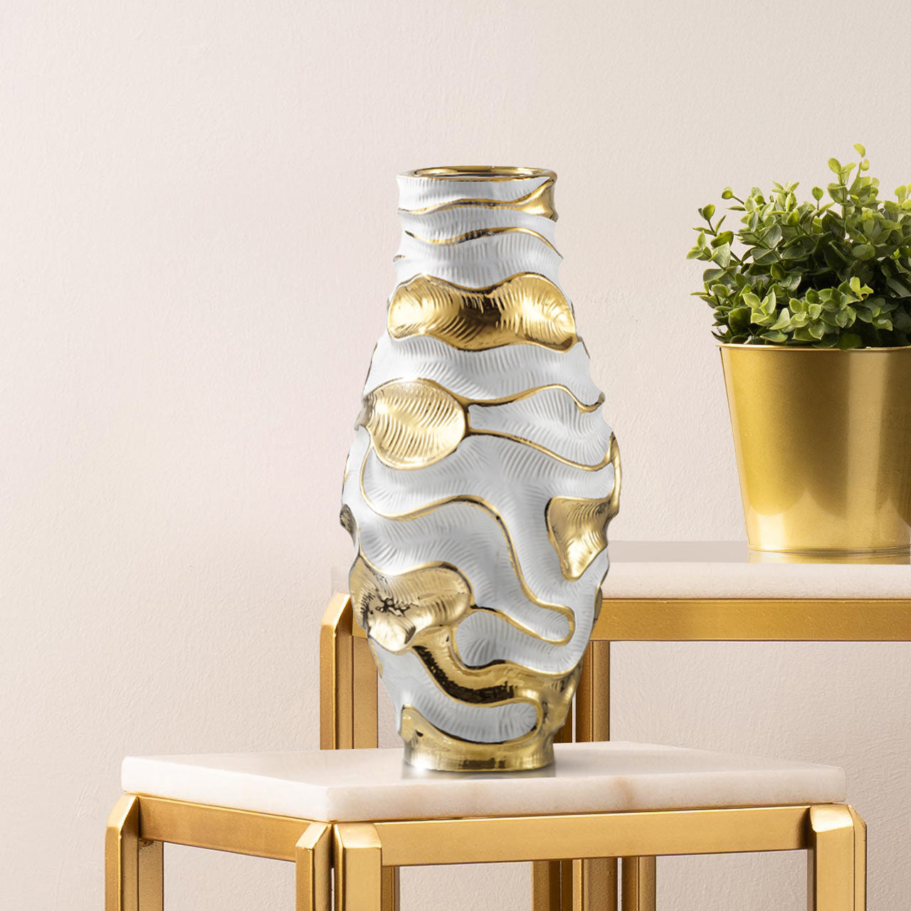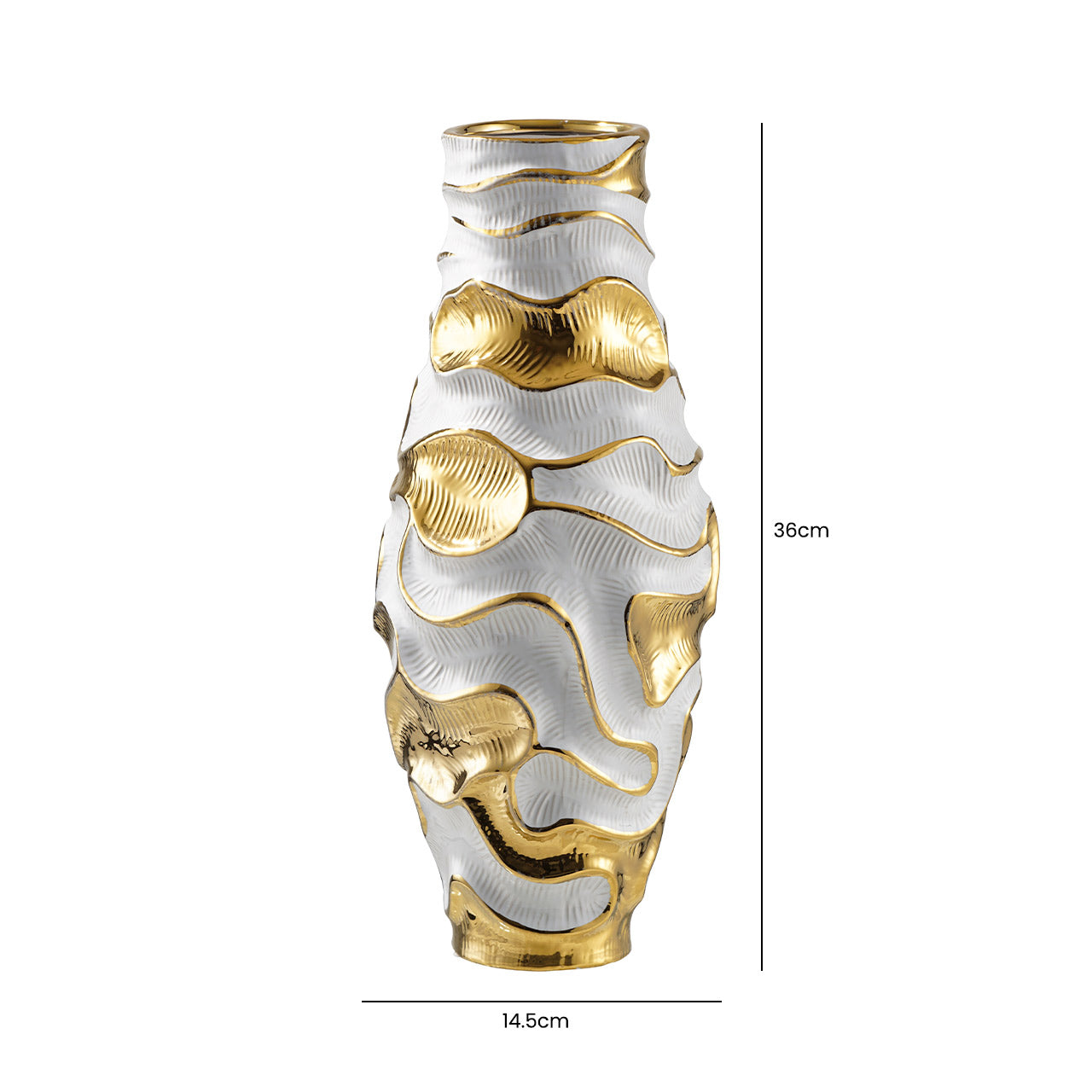 Bring artistic elegance to your home with this 36 cm White and Gold Textured Ripples Design Vase. Expertly crafted from high-quality ceramic, it features a sculptural wavy surface accentuated by glossy gold highlights that create a sense of movement and depth. The combination of smooth white tones and metallic accents adds a luxurious, contemporary touch to any setting.