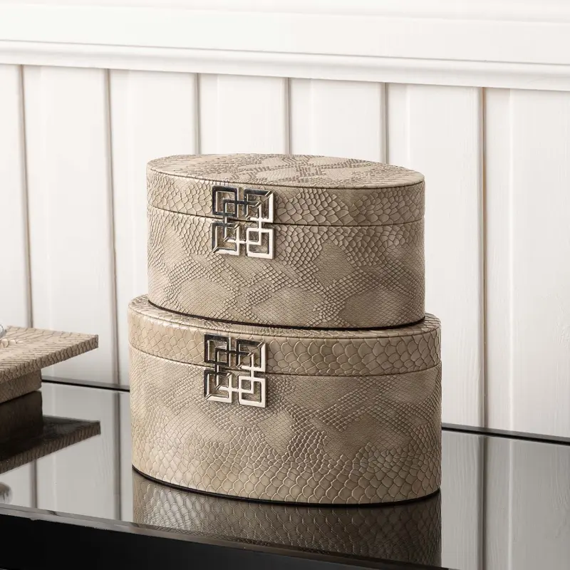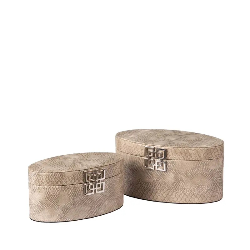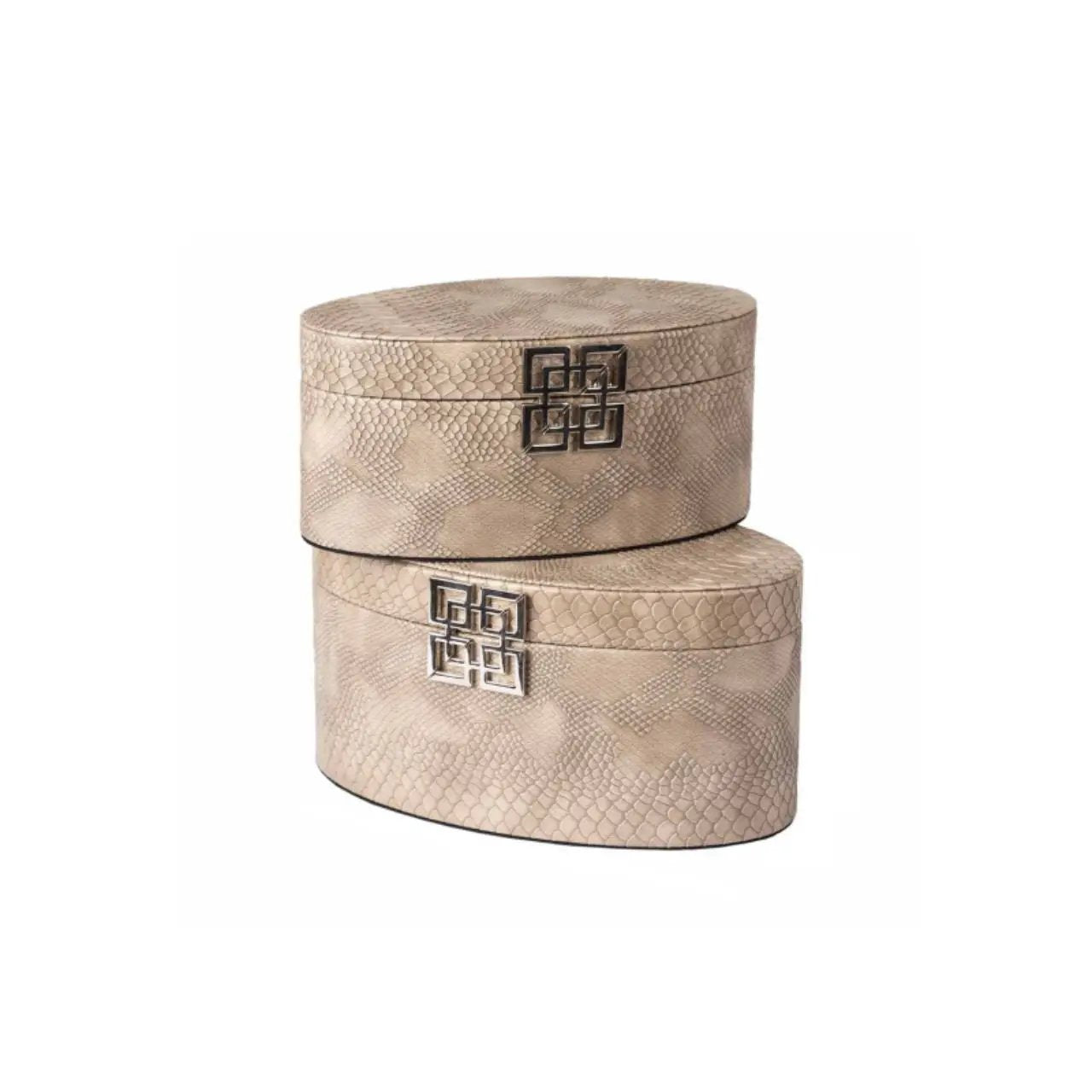 Elegant and practical, this set of two oval jewellery boxes combines refined texture with modern design. Crafted from wood and wrapped in soft taupe faux snakeskin leather, each piece features a sleek chrome geometric clasp that adds a polished, contemporary touch. The subtle reptile-inspired finish introduces quiet luxury to dressing tables, wardrobes or bedside storage.