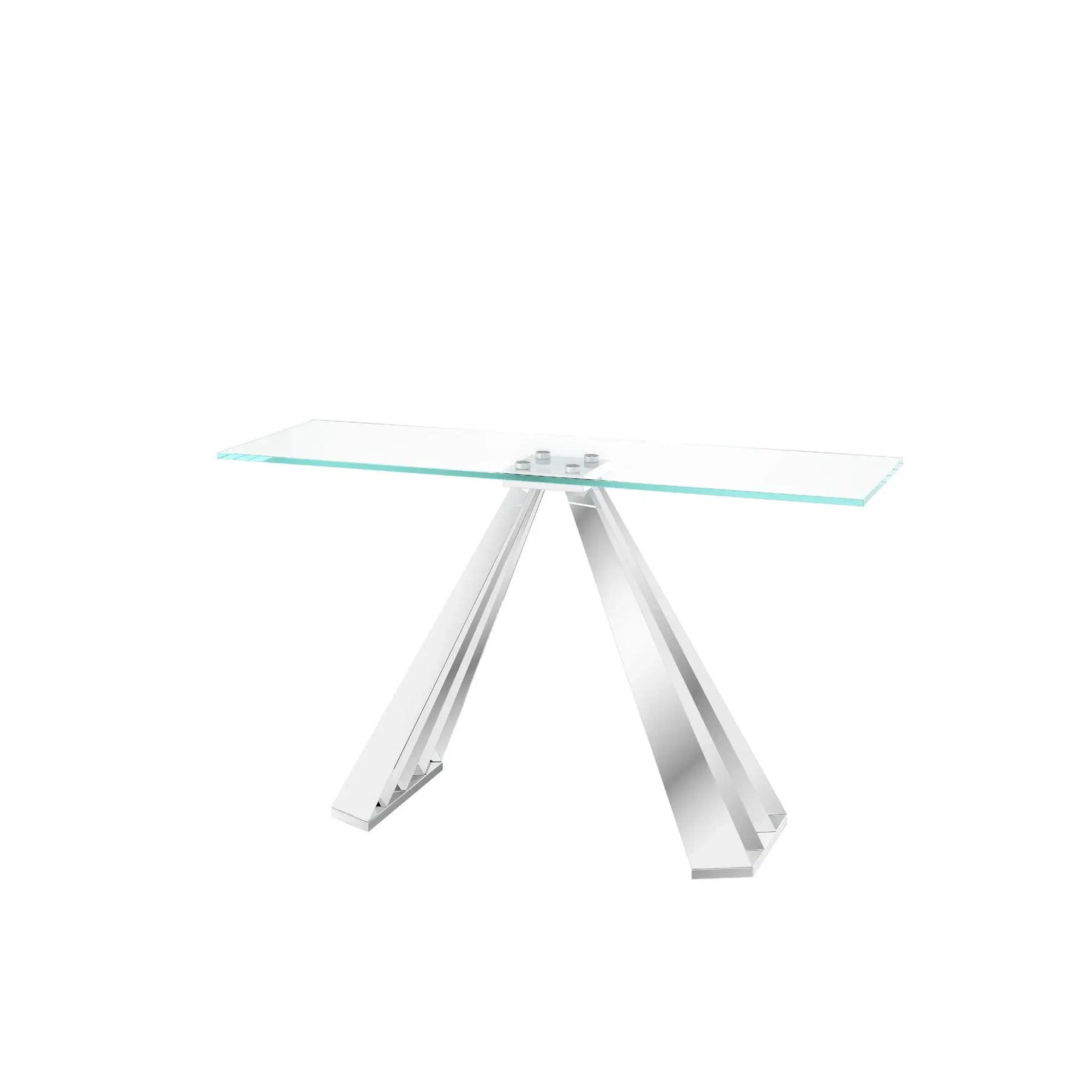 The base of the table is crafted from polished stainless steel, designed with angled, triangular legs that converge toward the centre. This innovative structure not only ensures stability and durability but also creates a striking visual focal point. Combining sleek aesthetics with functional design, the Alviero Console Table is perfect for hallways, living rooms, or entryways, elevating your interior with contemporary flair.