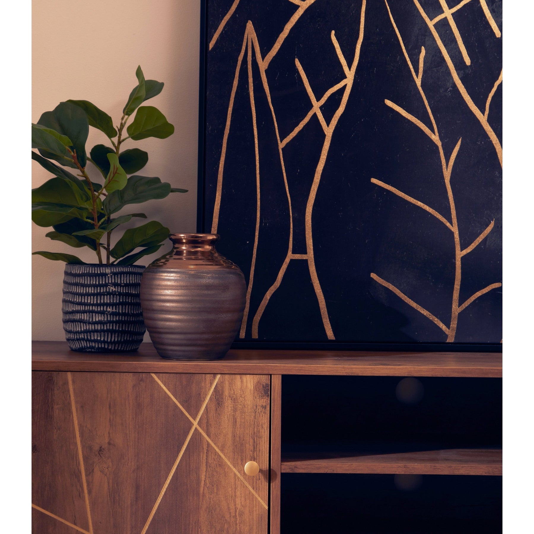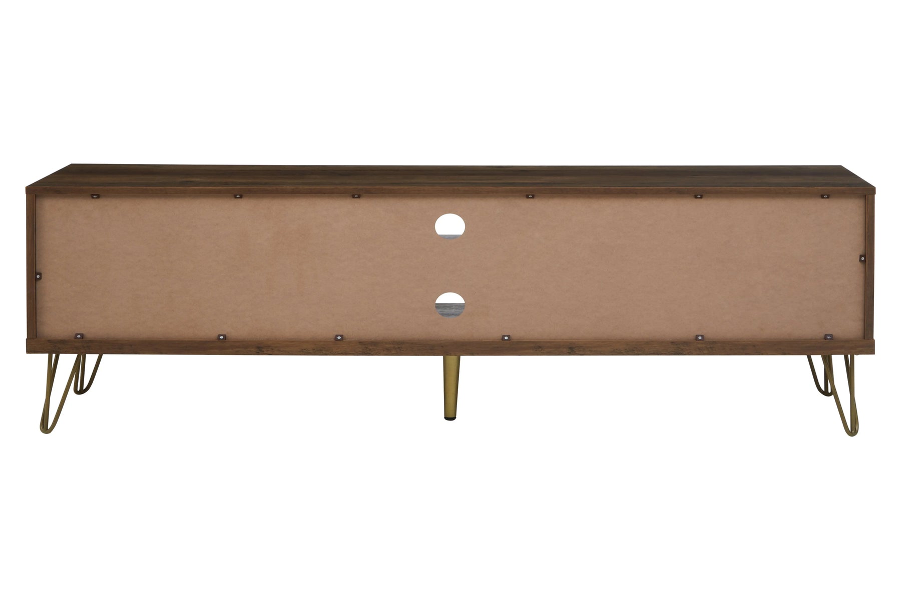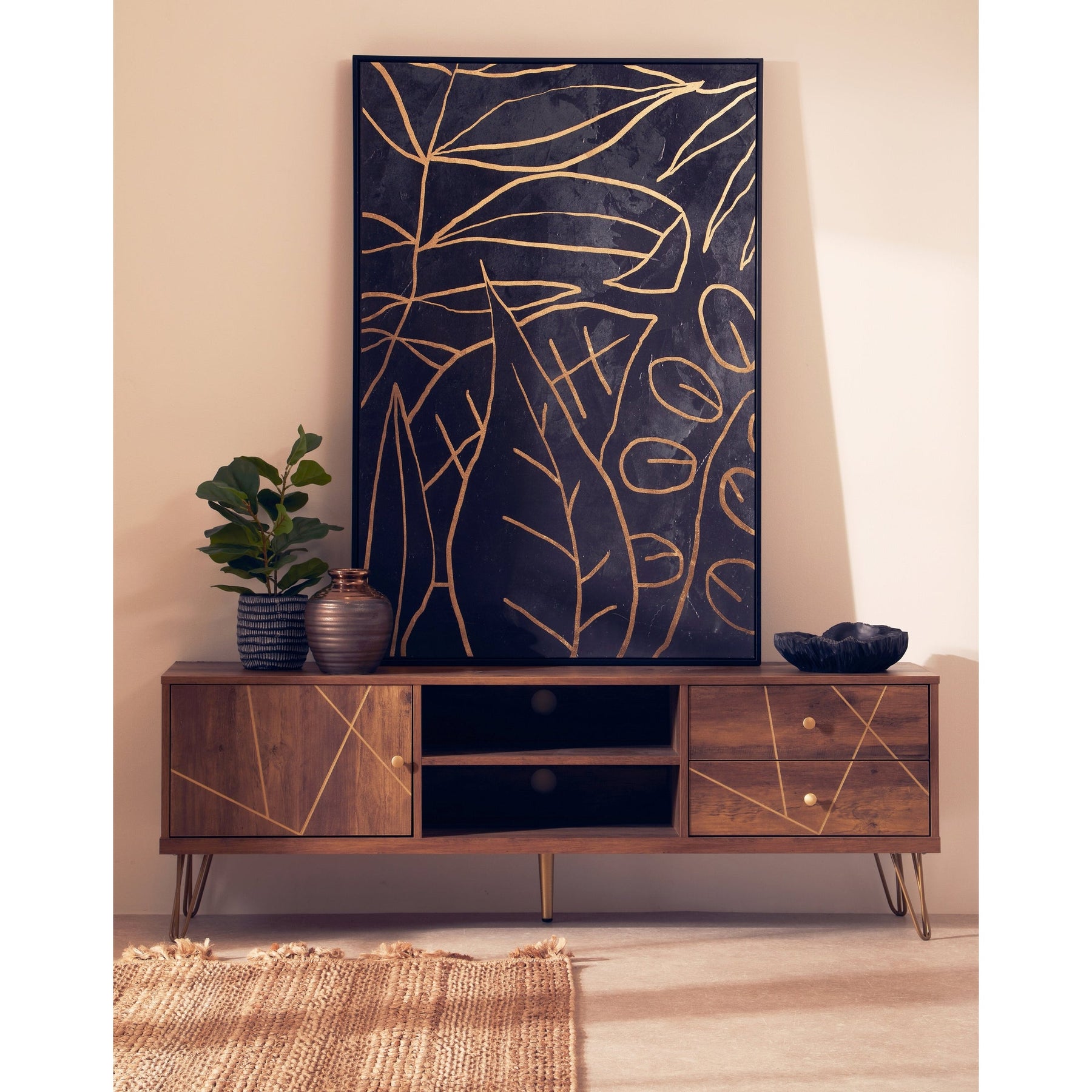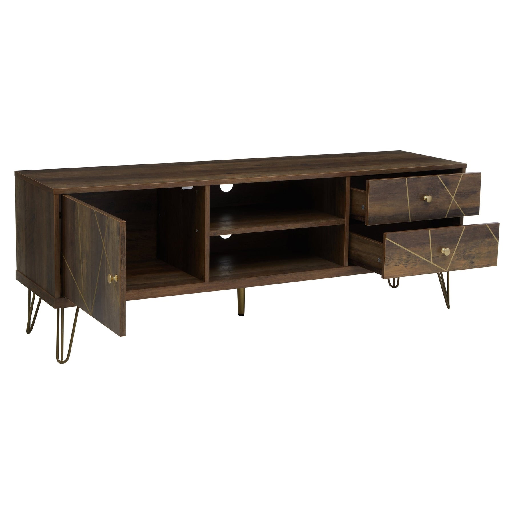 The Flora Media Unit combines mid-century modern design with practical storage, making it a stylish addition to any living area. Featuring a wood veneering effect, the unit adds warmth and a natural touch to your décor, while its geometric design and clean lines create a contemporary aesthetic. Sturdy hairpin metal legs in a warm metallic finish elevate the unit, giving it a light and airy appearance.