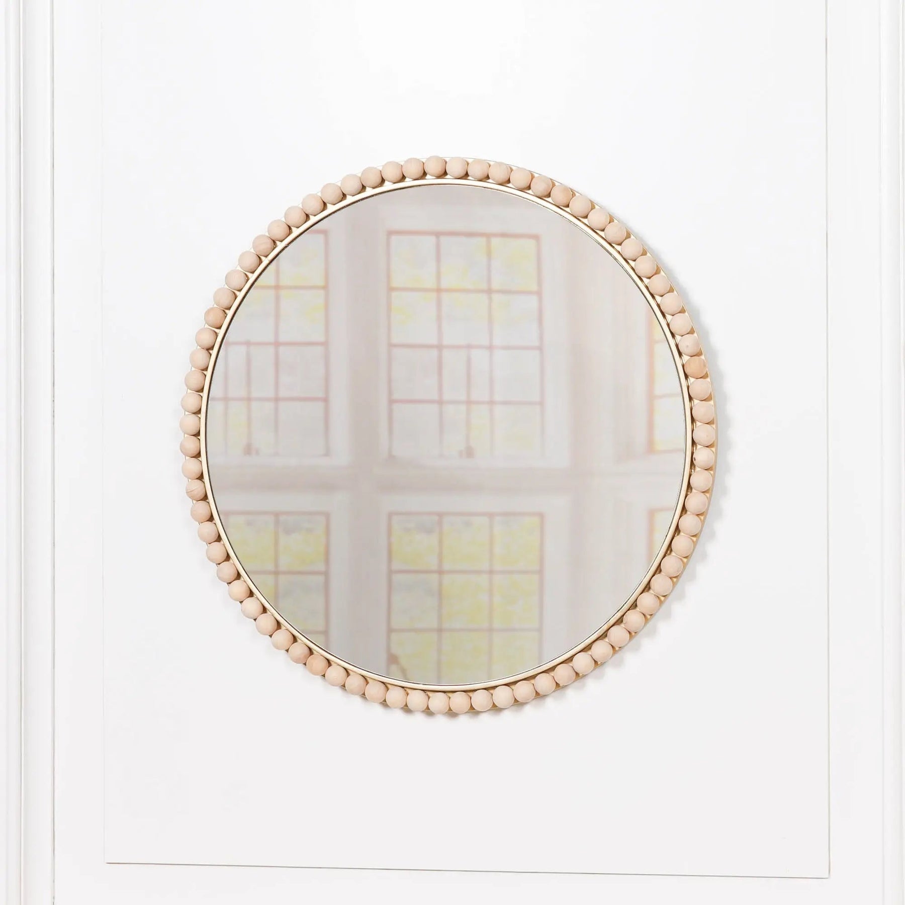 The Wooden Bobble Round Wall Mirror adds charm, texture, and understated elegance to any interior. Featuring a gold-painted circular frame surrounded by decorative wooden bobbles, this mirror blends contemporary sophistication with natural warmth. The tactile detailing introduces depth and character, making it an ideal statement piece for hallways, bedrooms, or living rooms.