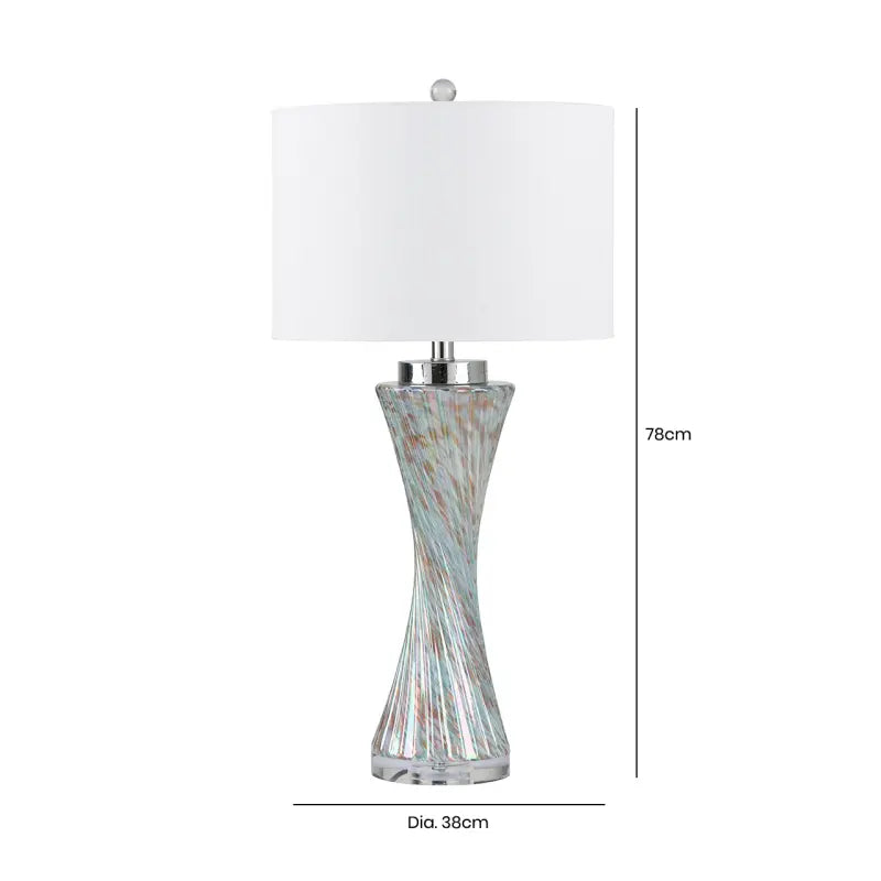 Illuminate your space with sophistication using the Clear Blue Gold Twist Table Lamp with White Linen Shade. This elegant lamp features a stunning twisted glass base in clear blue and gold tones that beautifully reflect light, creating a shimmering, multicolour effect. The white linen lampshade adds a refined contrast, diffusing a soft, warm glow that enhances any interior with elegance and charm.