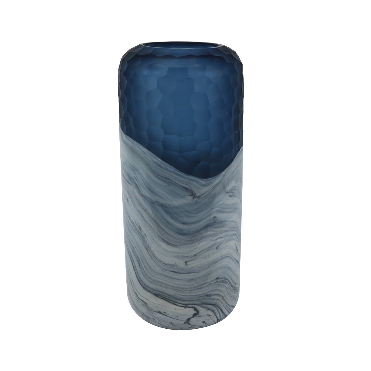 Elevate your décor with this 36 cm Dark Blue and White Handmade Glass Vase, a striking fusion of artisan craftsmanship and modern design. The vase features a rich, textured dark blue top that gradually flows into a smooth white marbled base, creating a harmonious contrast reminiscent of ocean waves. Its sleek cylindrical silhouette adds a sense of height and elegance to any space.