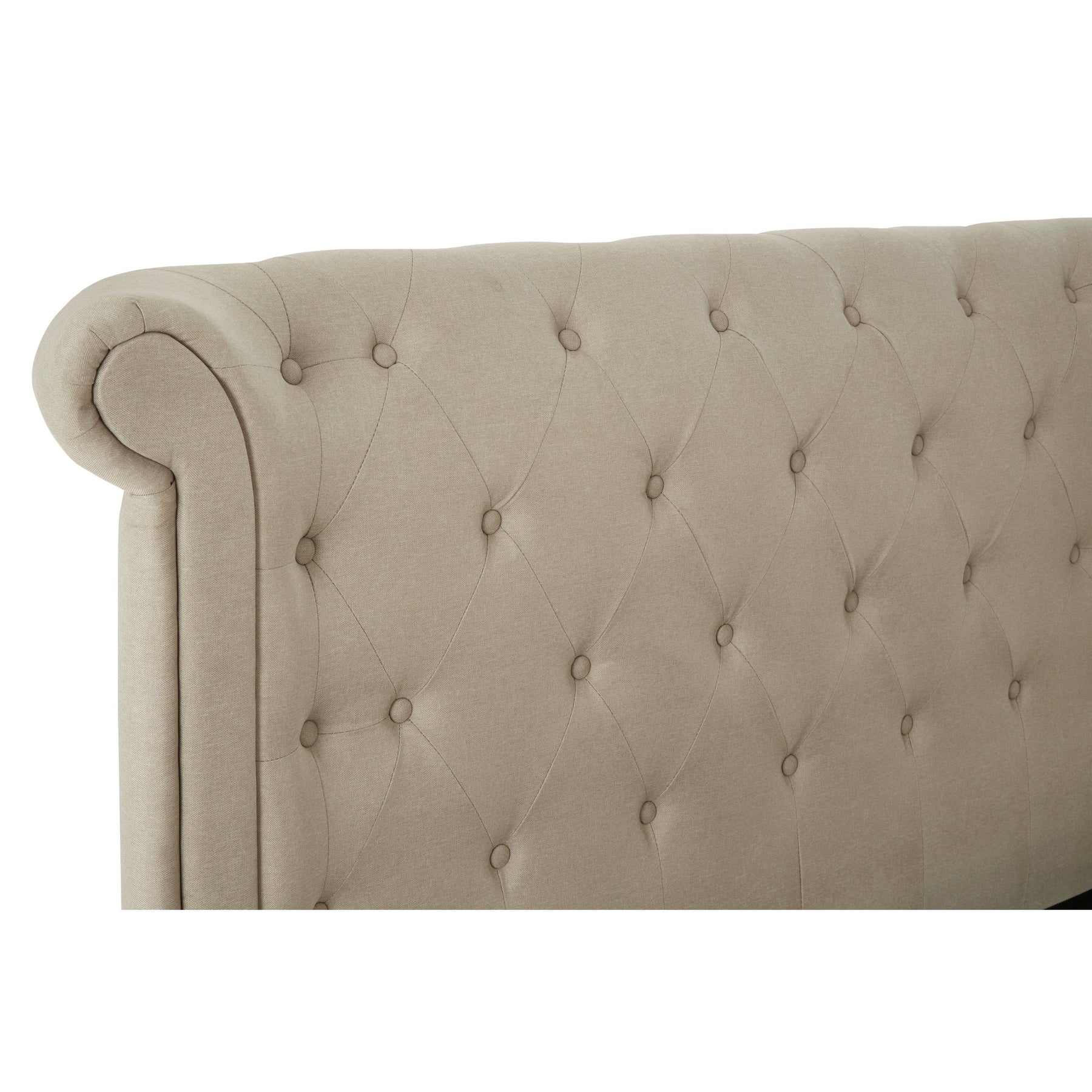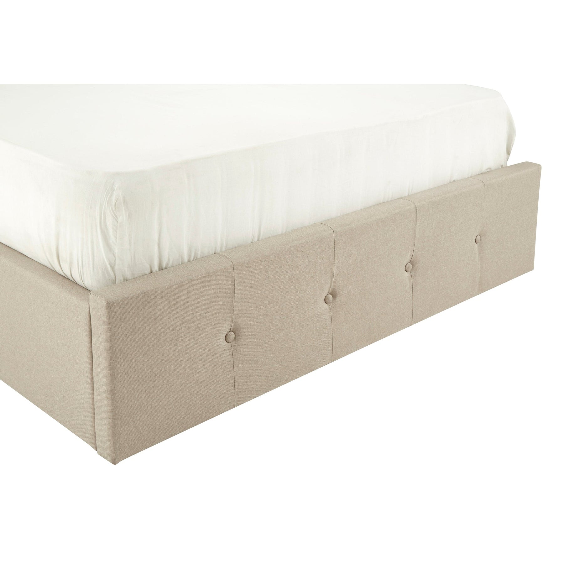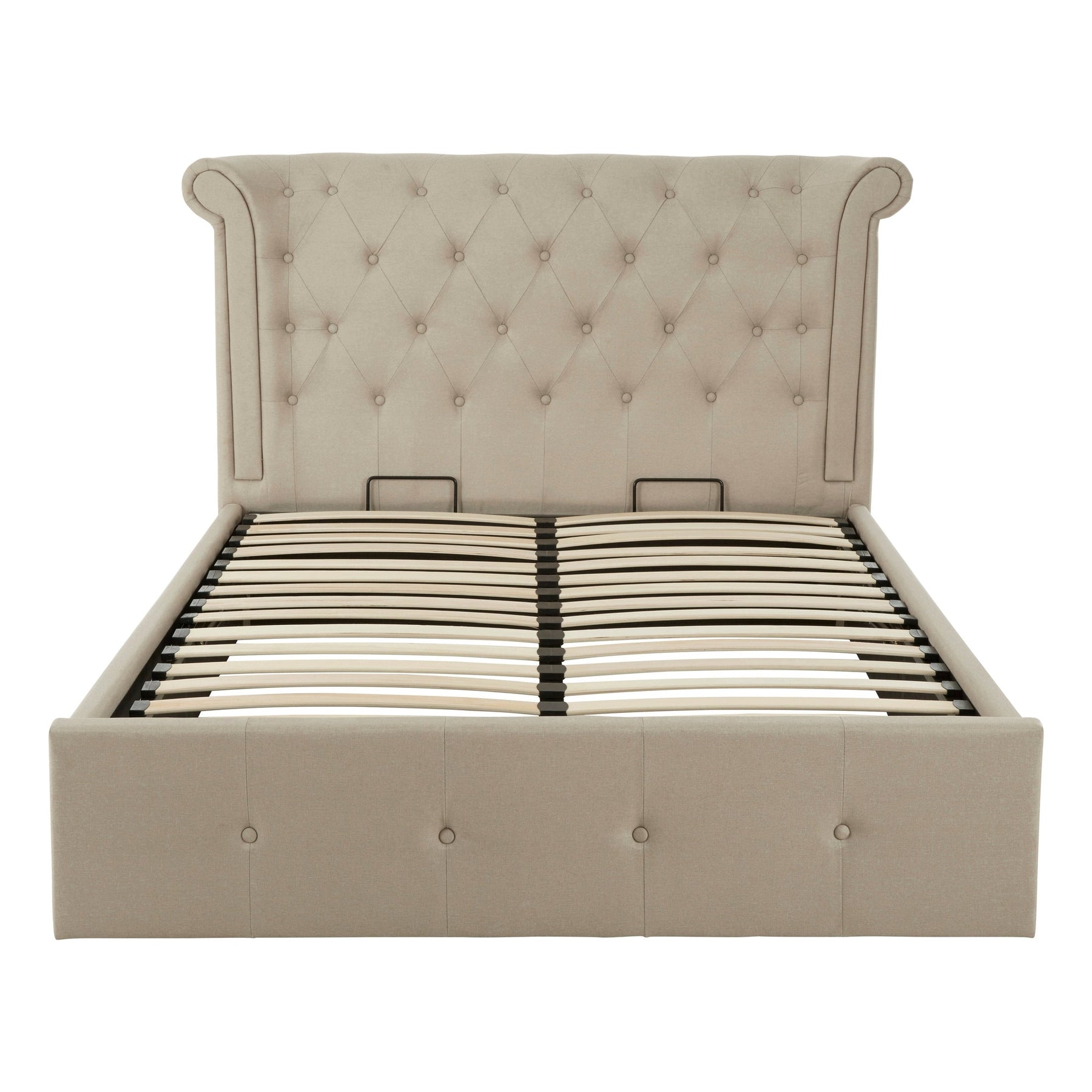 The Edric Ottoman Bed blends a calm, contemporary look with practical storage. Upholstered in soft beige linen-effect fabric, the tall, button-tufted headboard and wingback sides add tailored detail, while the sturdy frame lifts easily to reveal generous under-bed storage for bedding, pillows and seasonal items.