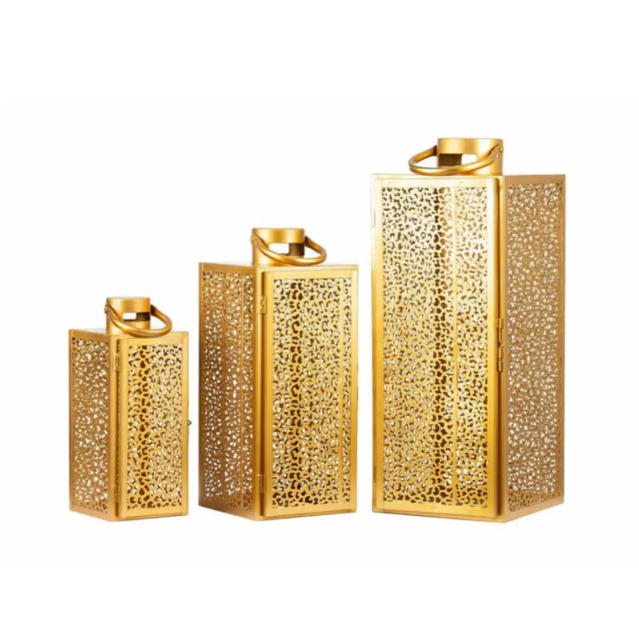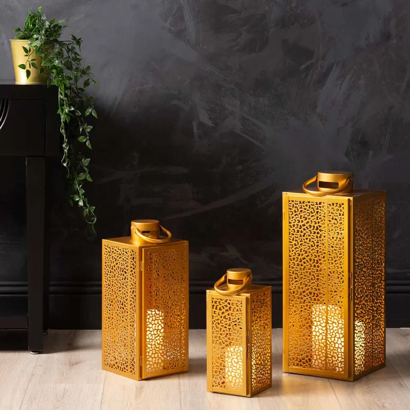Lift your styling with the Esme Set of 3 Gold Steel Lanterns. Finished in a sophisticated brushed gold, each lantern pairs a timeless silhouette with sturdy steel construction, adding a warm, elegant glow to contemporary and classic décor alike—indoors or out.