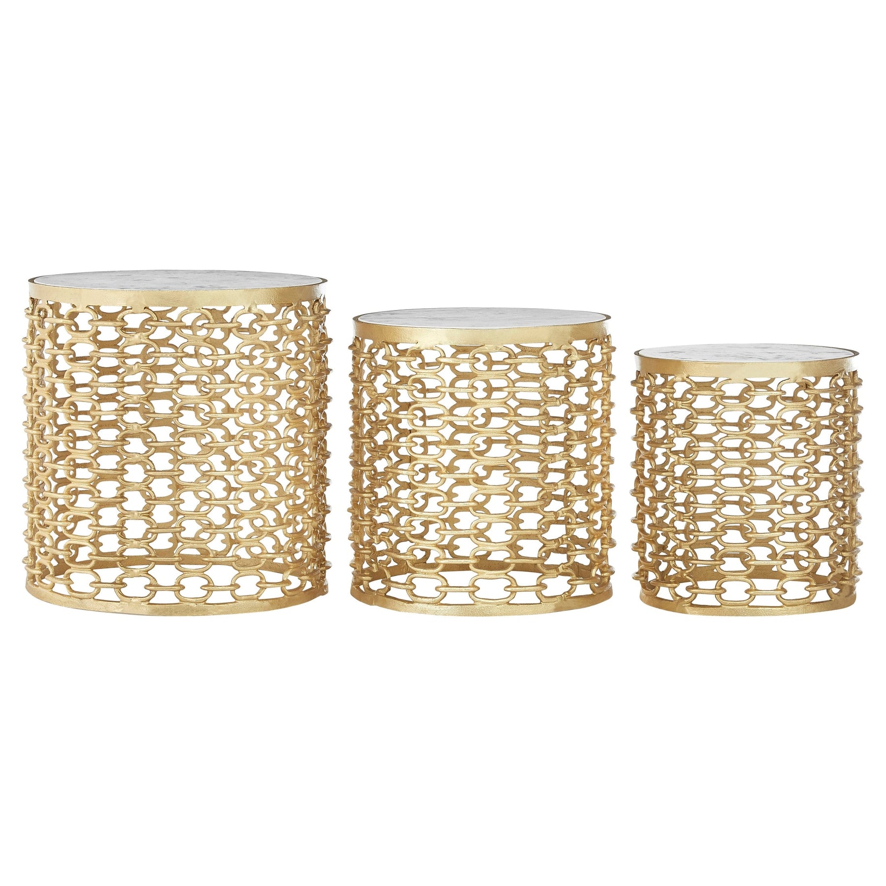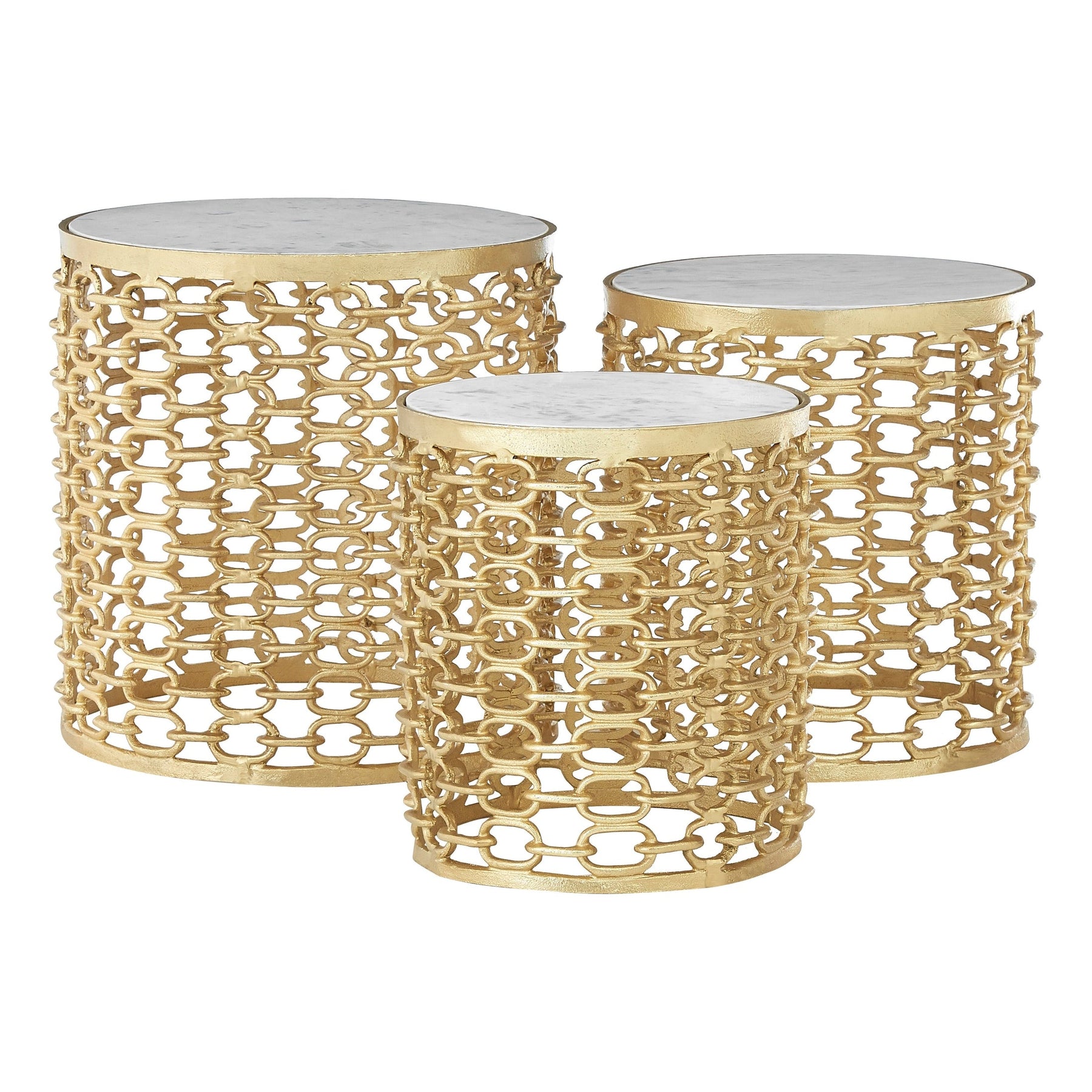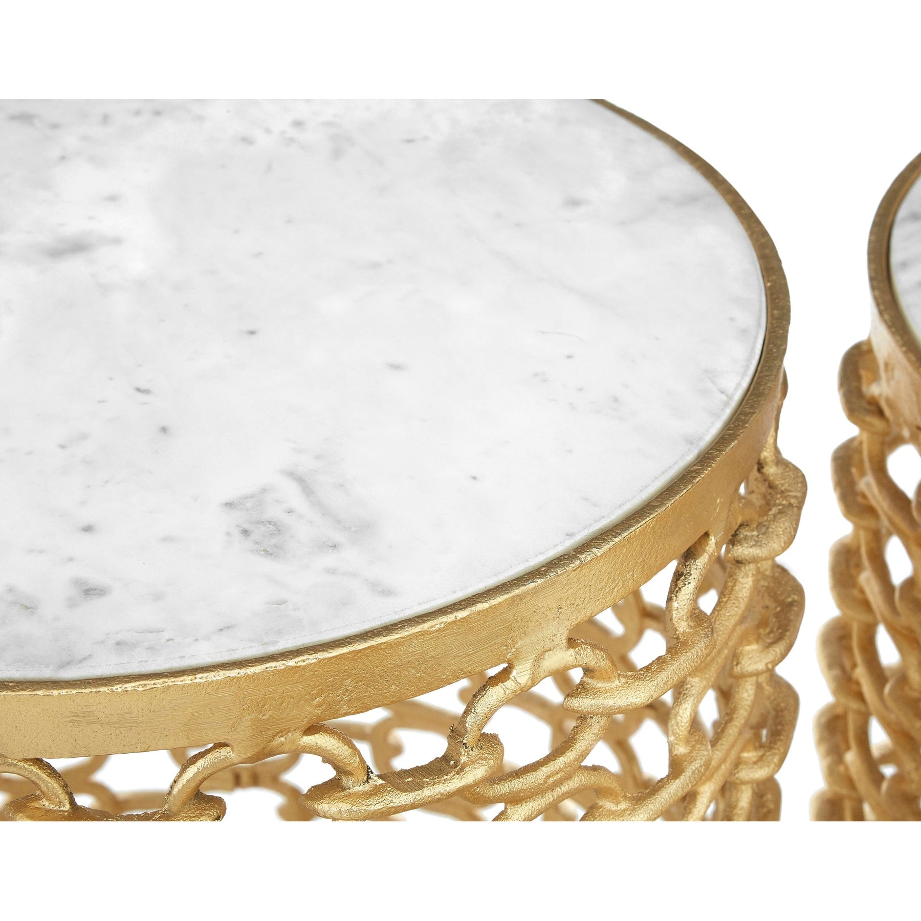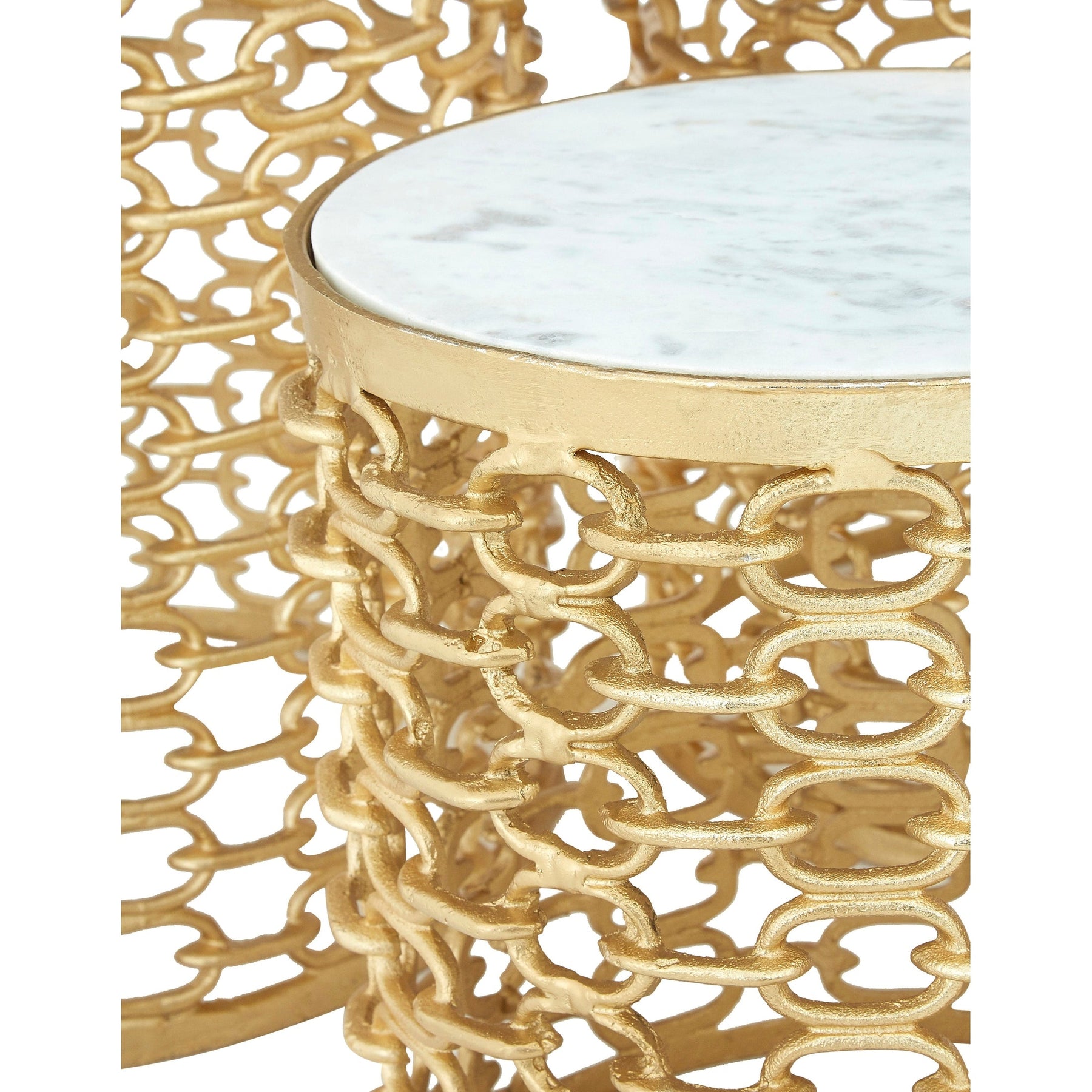 The Tempran Set of Three Aluminium Side Tables brings a touch of luxury and global charm to your living space. Each handcrafted table features an intricate chain-link design finished in a warm gold tone, creating an elegant and artistic base. The high-polished marble surface adds a refined contrast, elevating the overall look with timeless sophistication.