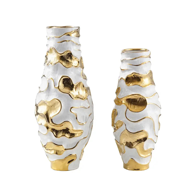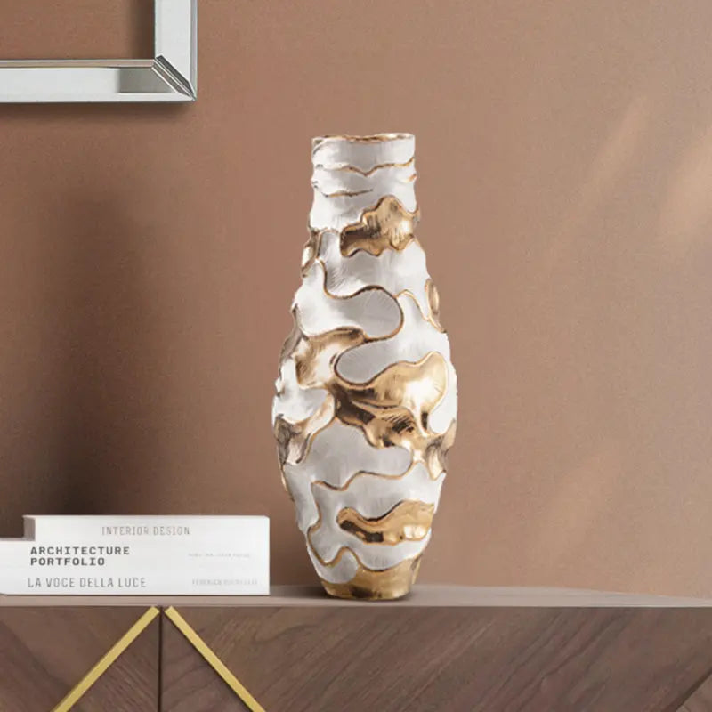 The pristine white finish is enhanced with subtle gold accents, highlighting the undulating design and adding a touch of opulence to your décor. Perfect for displaying fresh or dried flowers or as a standalone centrepiece, it complements both modern and classic interiors with effortless grace.