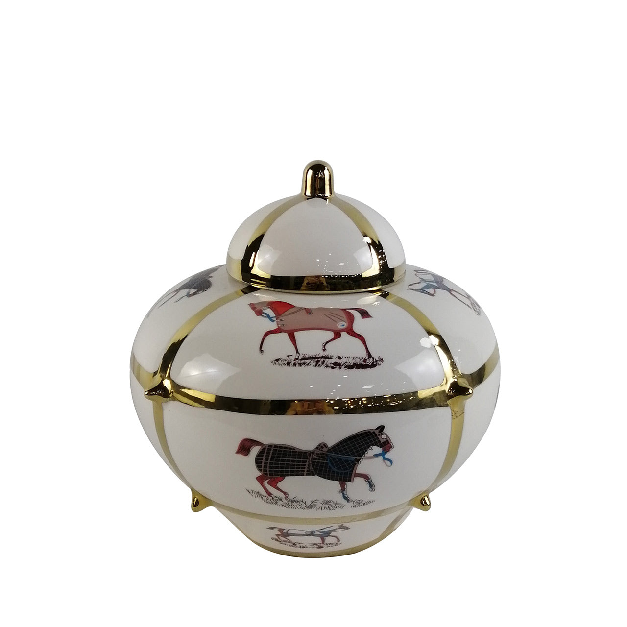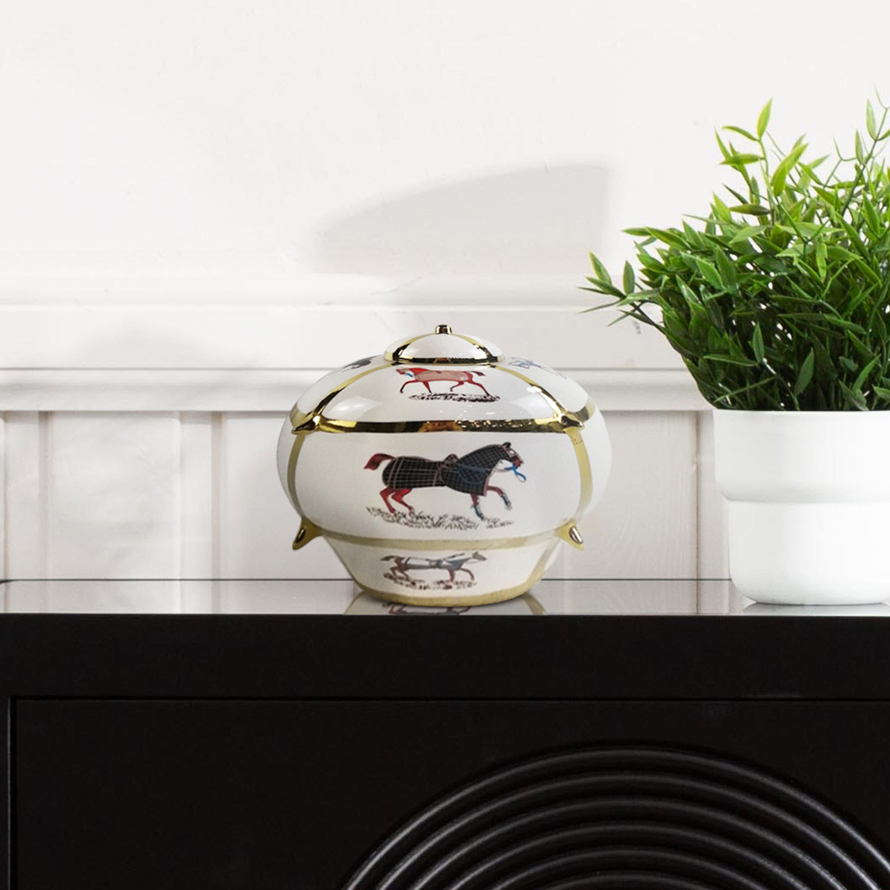 Whether used as a standalone ornament, for keeping small essentials, or as part of a curated display, this white ceramic ginger jar with horse design adds sophistication and personality to your décor.