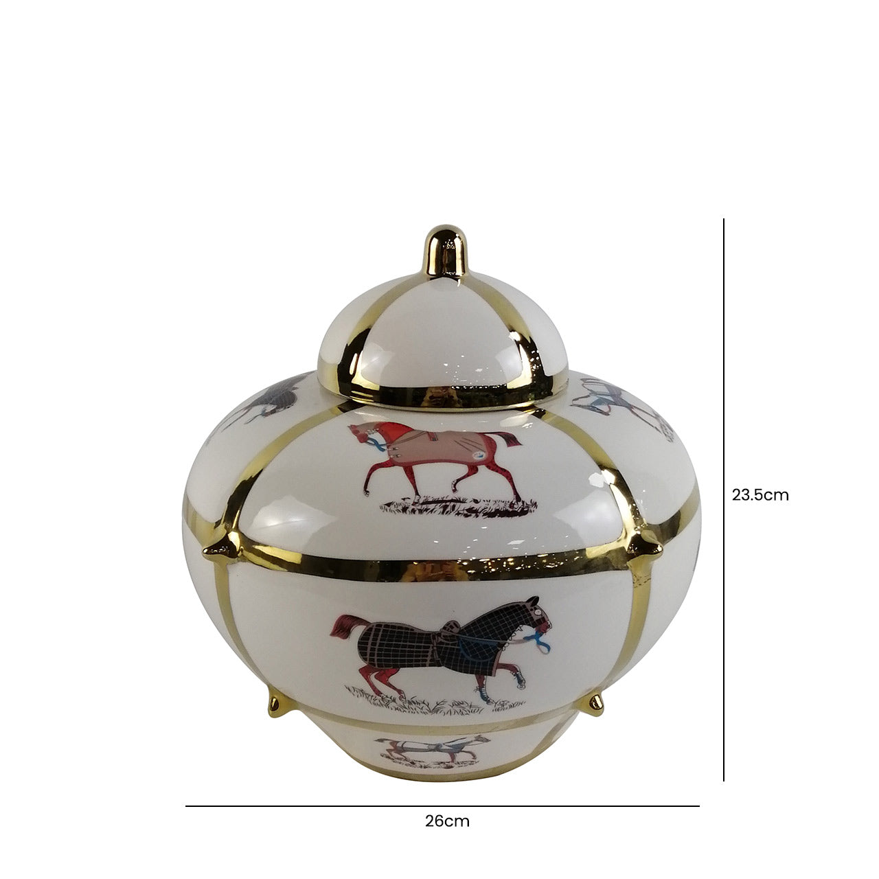 The compact 23.5cm size makes it a versatile piece, perfect for styling on mantels, side tables, or as part of a larger decorative arrangement. Its classic ginger jar silhouette paired with the horse engraving brings a unique, nature-inspired charm that complements both modern and traditional interiors.